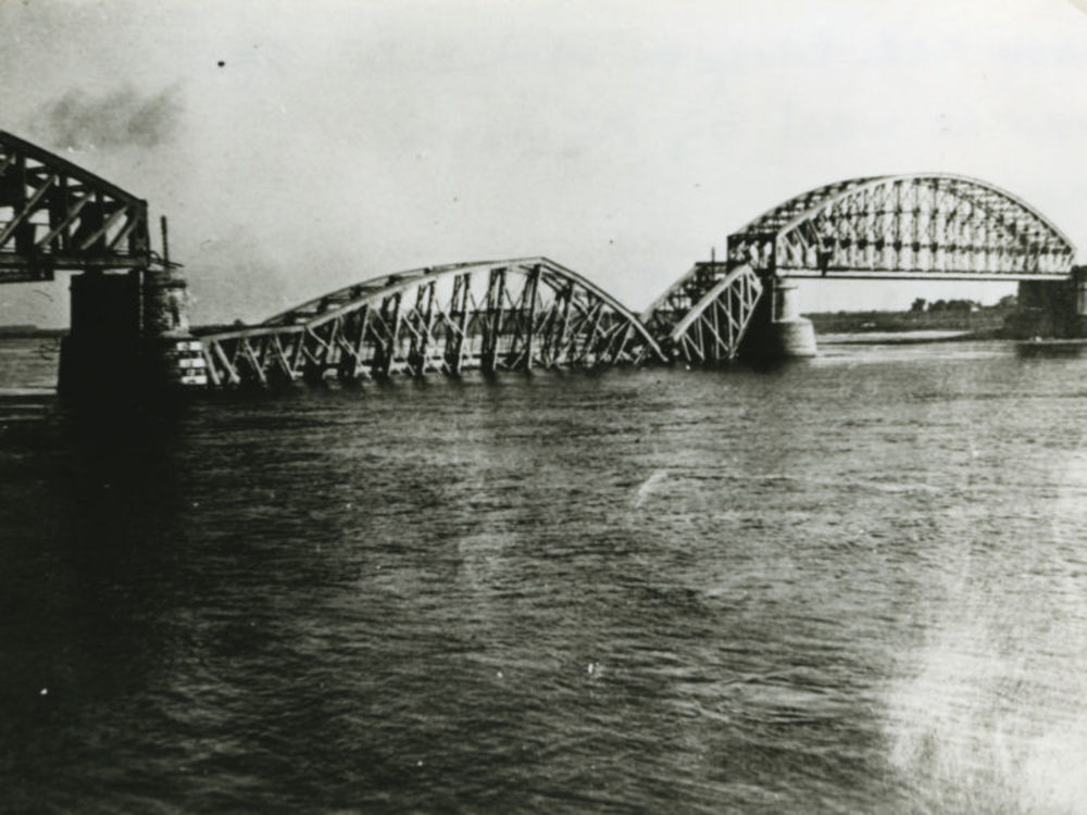 Foto opgeblazen spoorbrug te Nijmegen, mei 1940. Tek...