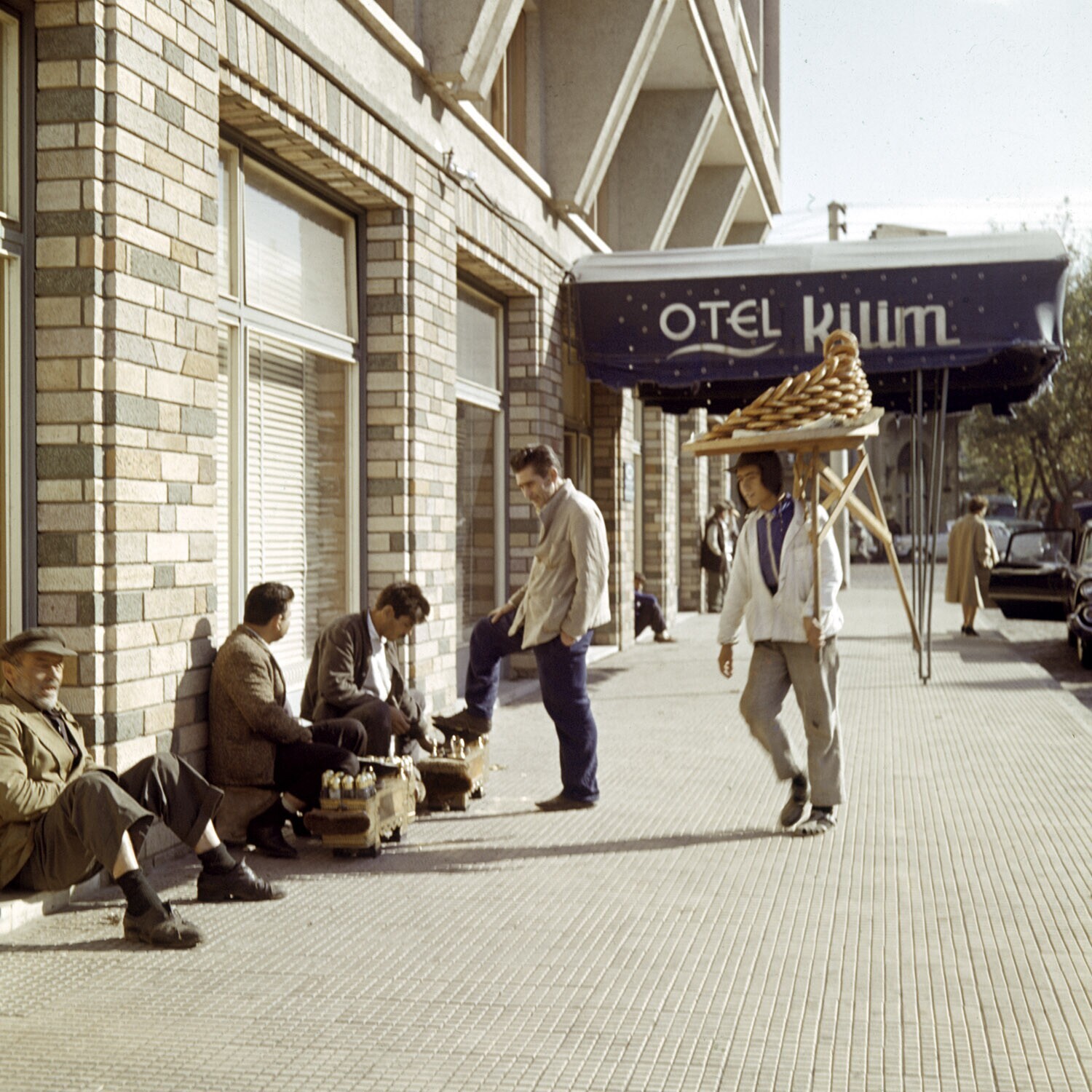 Straatbeeld met schoenpoetsers en een verkoper van k...