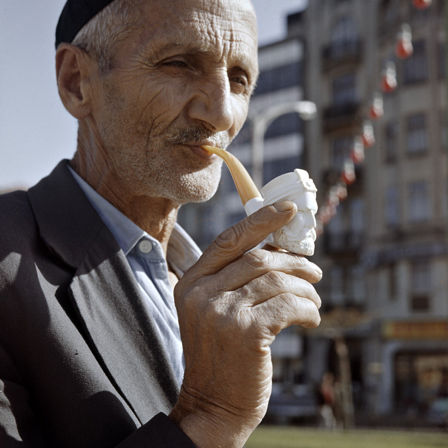 Oude man met een pijp, gemaakt van meerschuim, dat g...