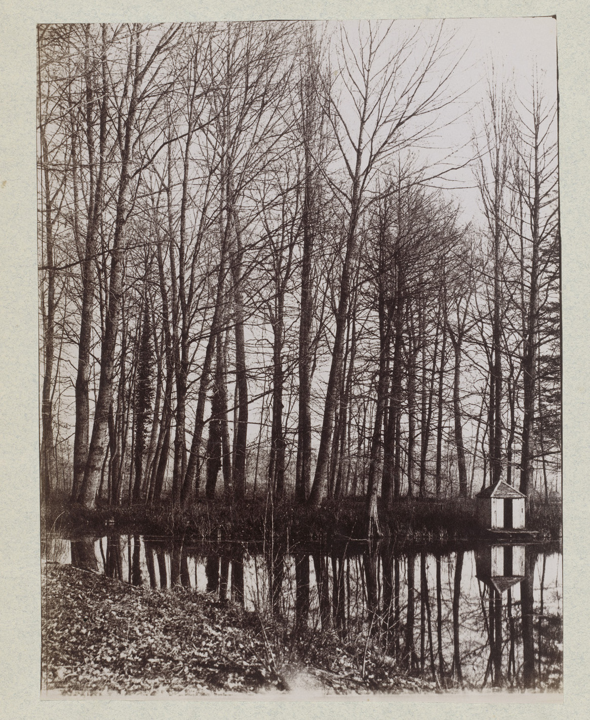 Gezicht op een vijver met bomen en huis
