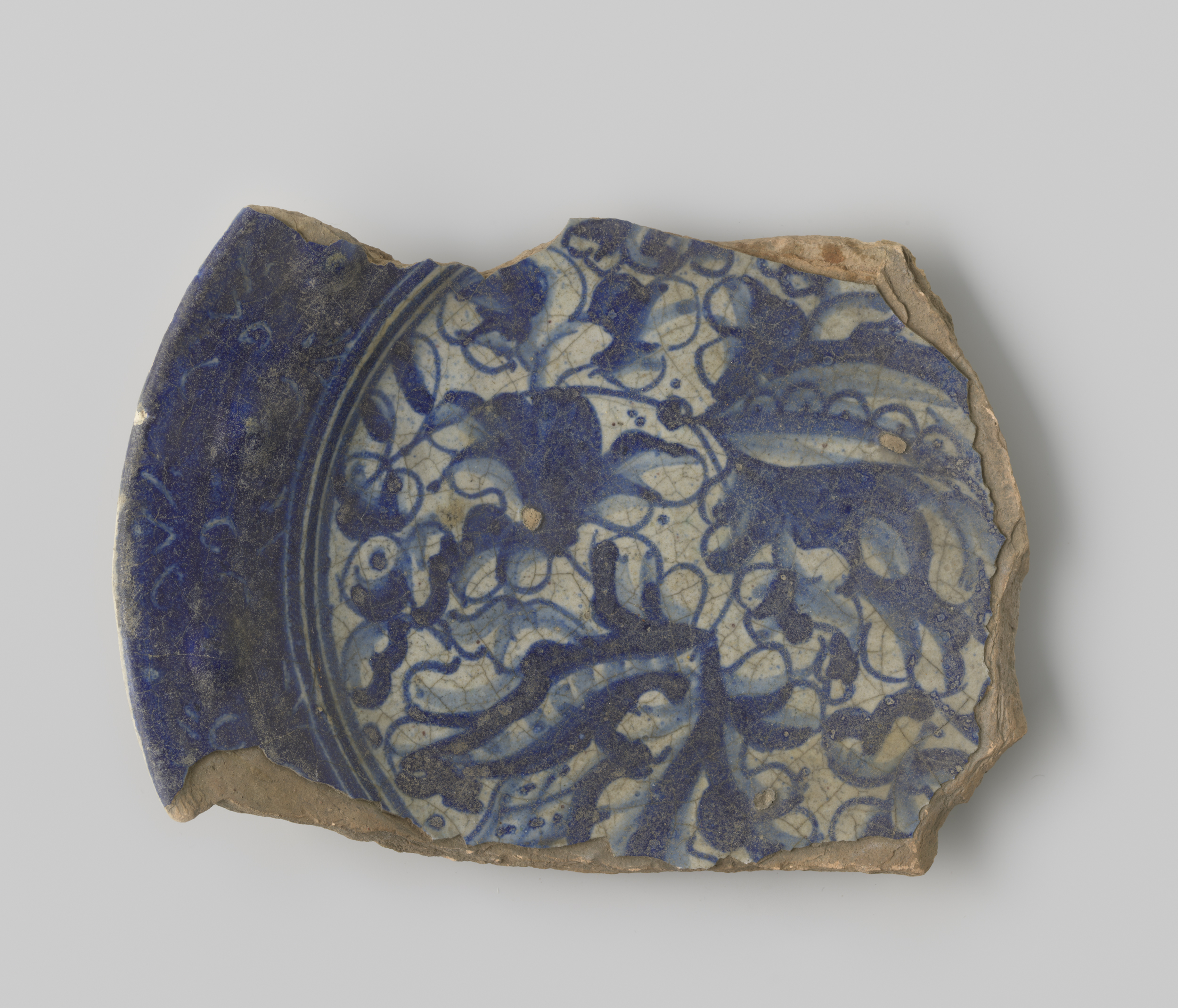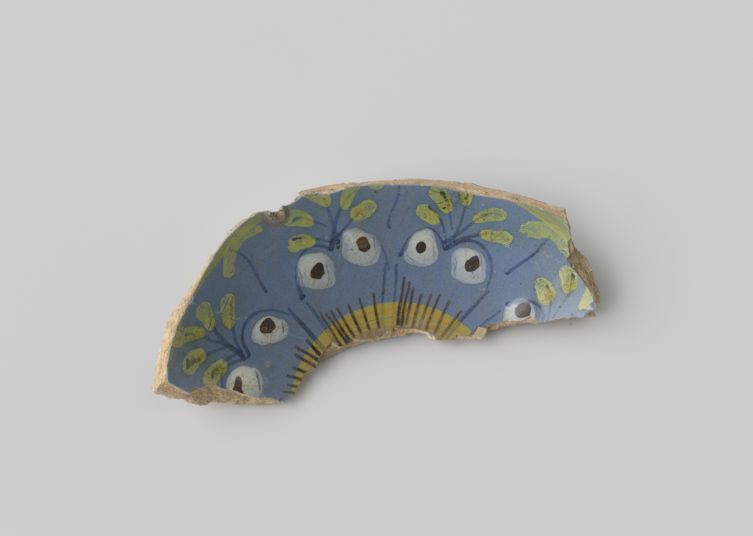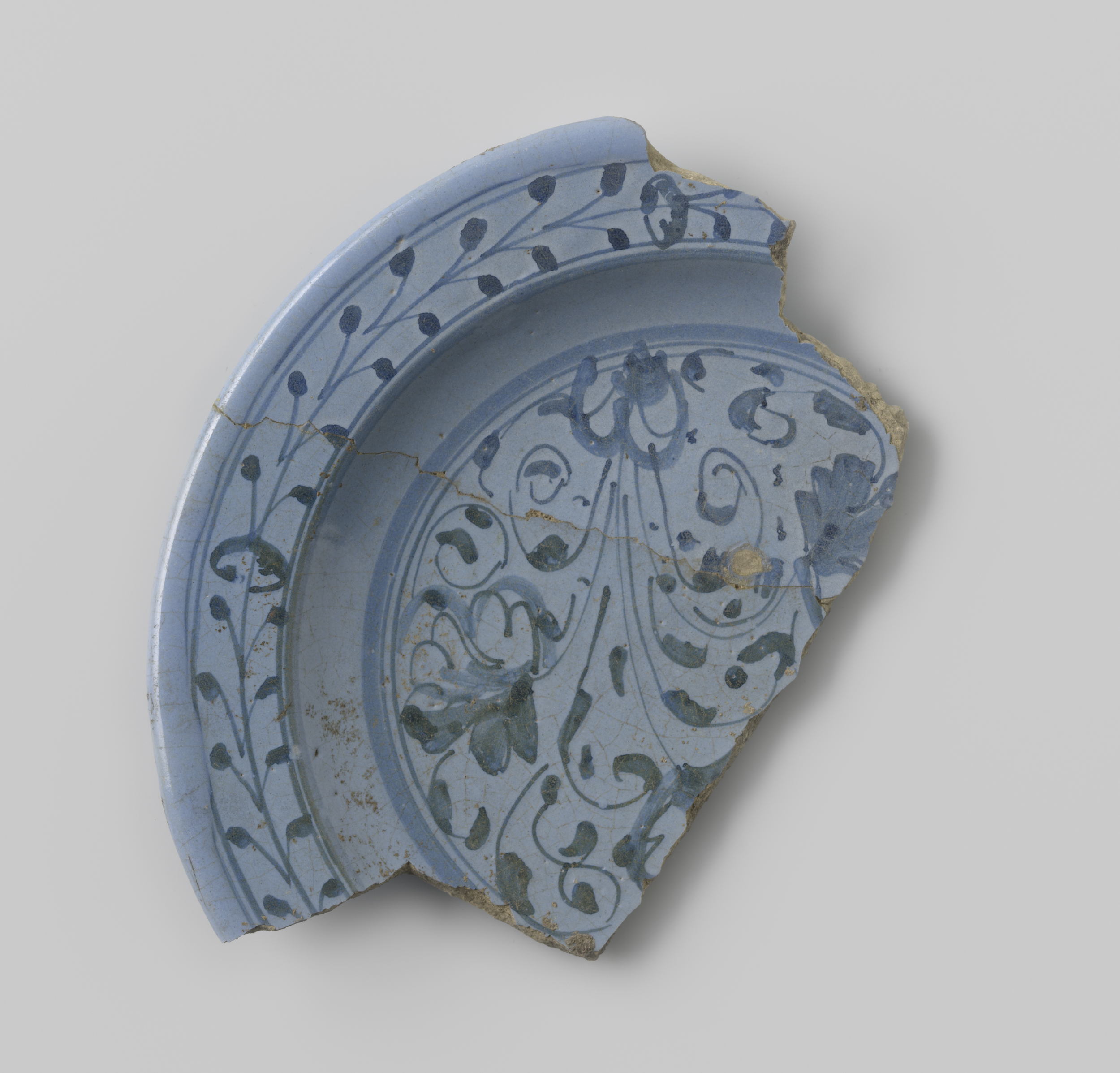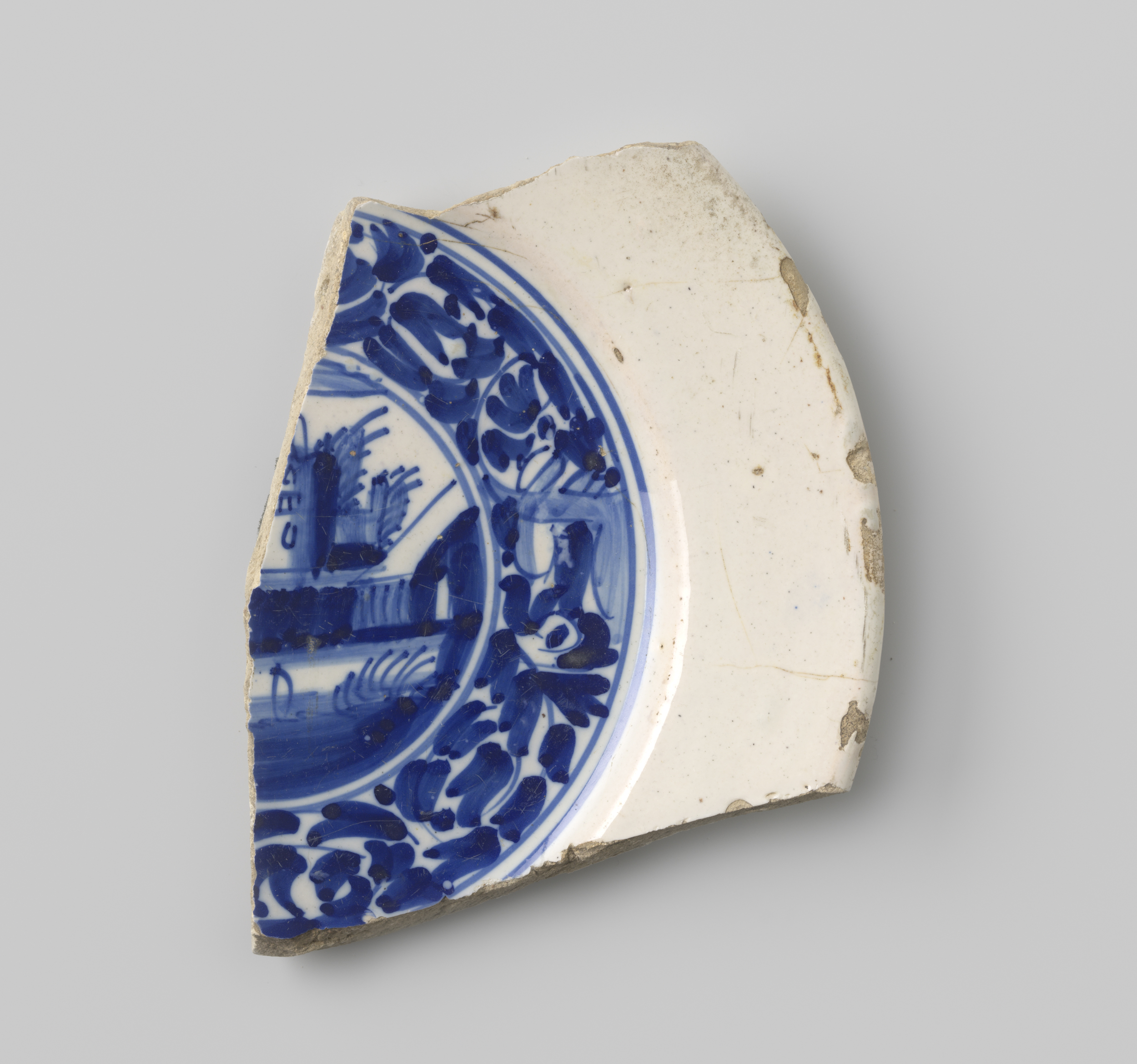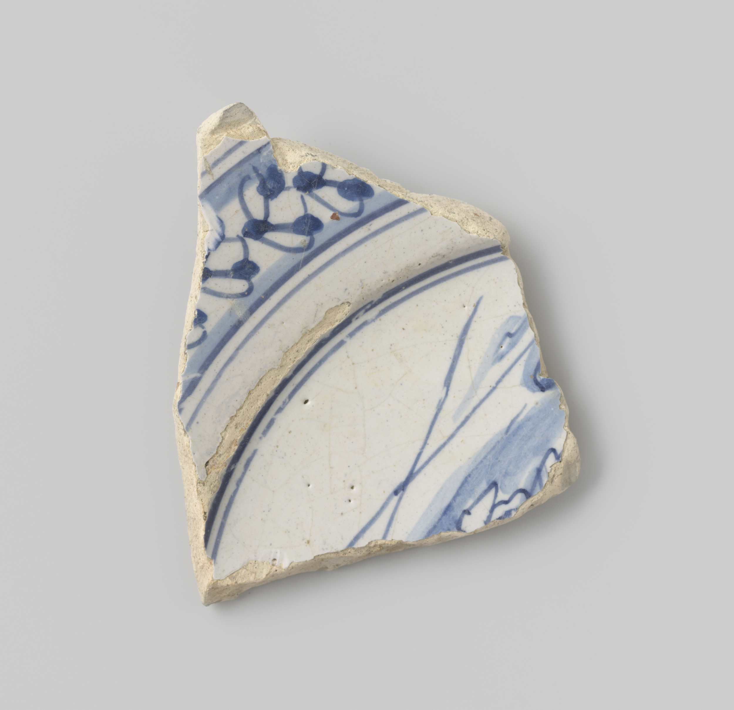 Schotelscherf van witbakkend aardewerk, voorzien van...