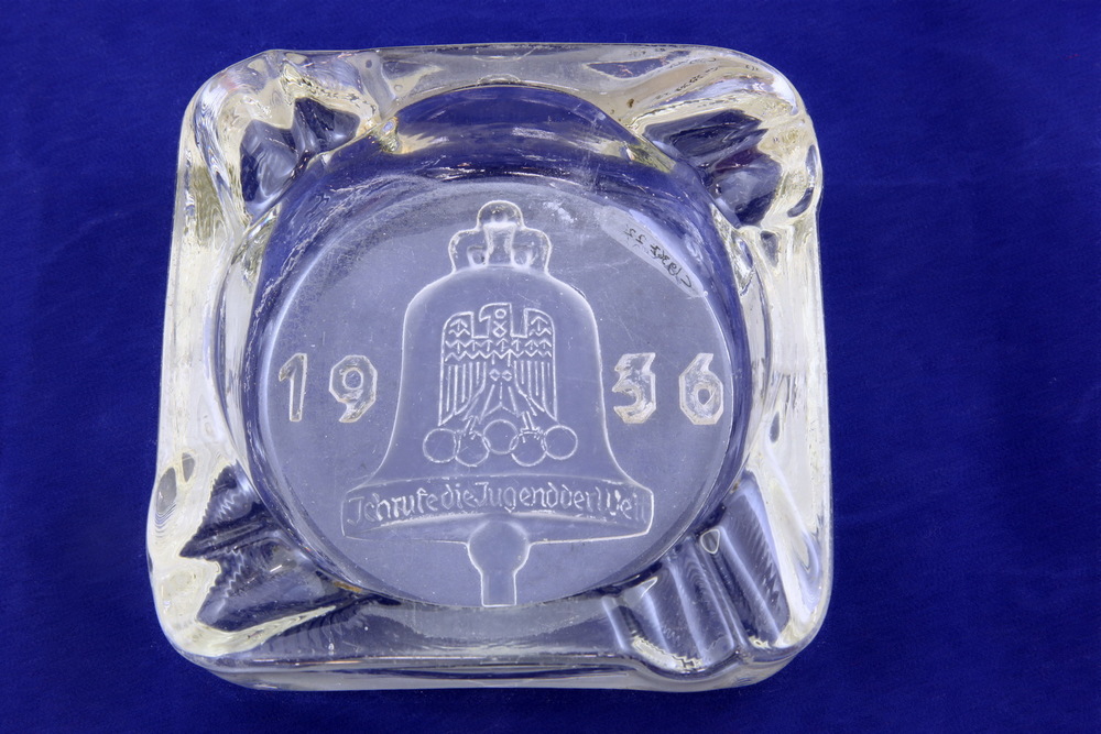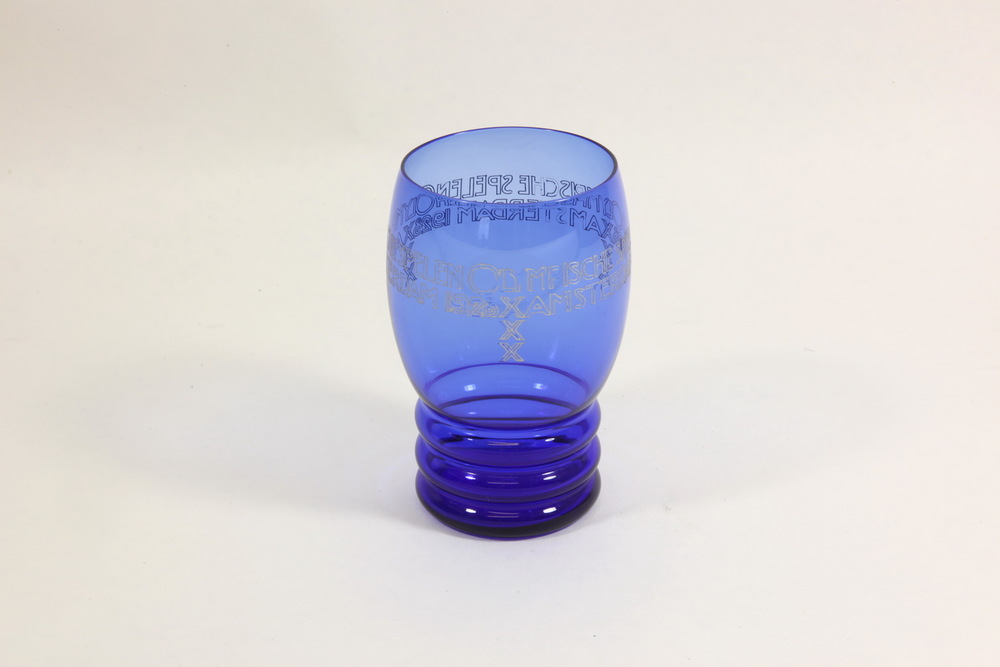 Blauw ingegrafeerd sierglas van de Olympische Zomers...