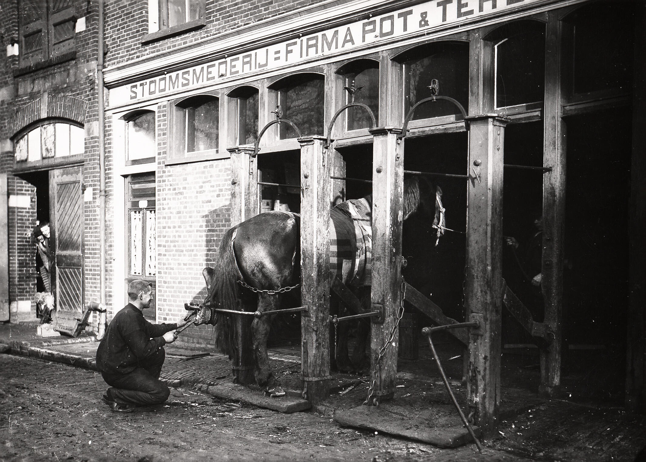 Beslaan van een paard, Groningen, 1911 (zwart-wit foto)