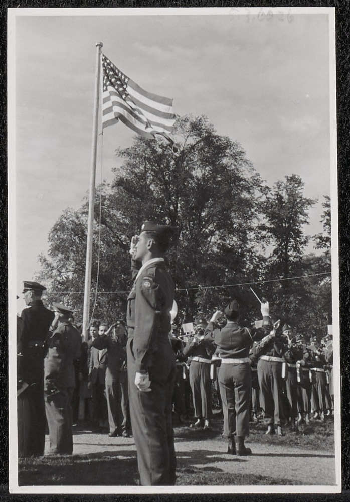 Herdenking 1945, saluerende Amerikaanse kapitein met...
