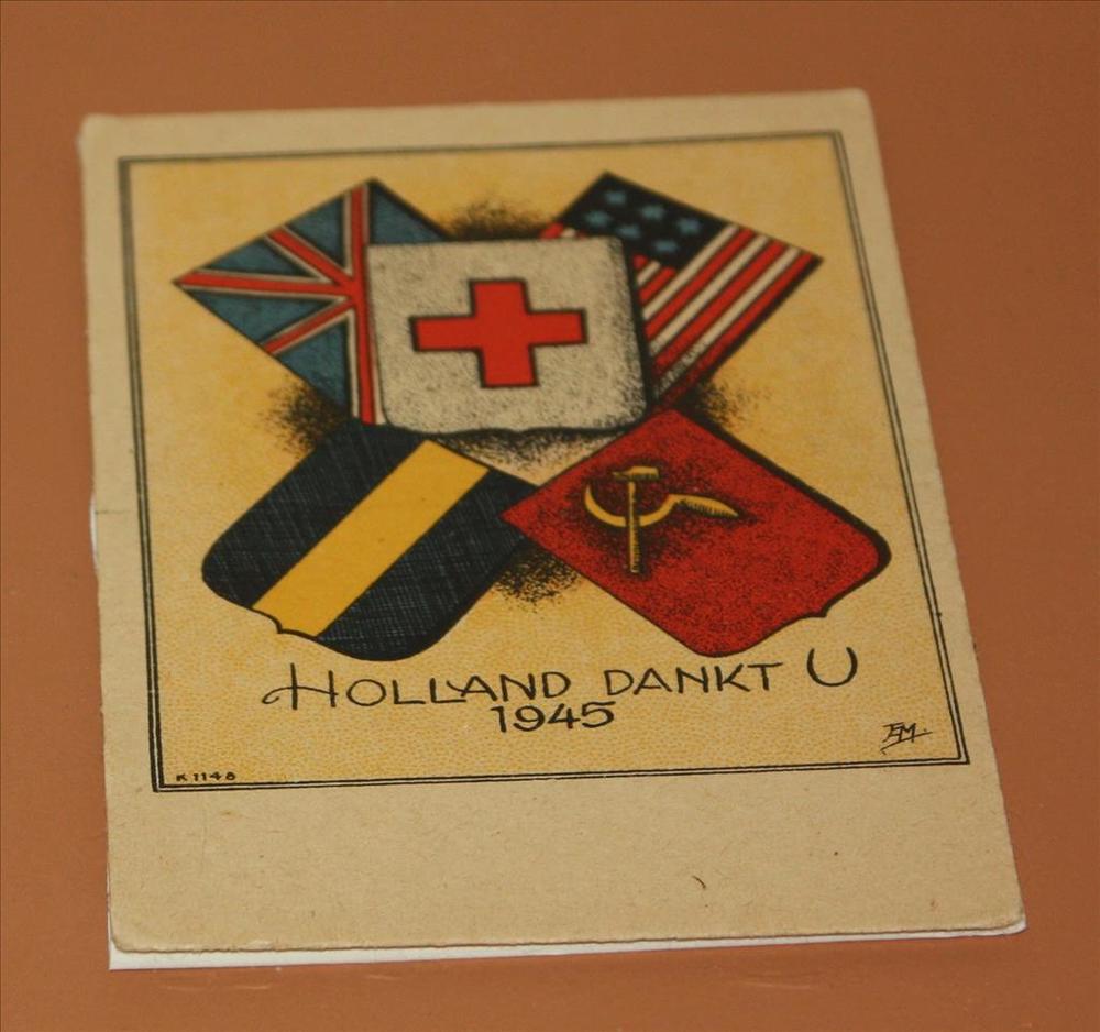 postkaart tekst: “Holland dankt u” met de vlaggen va...