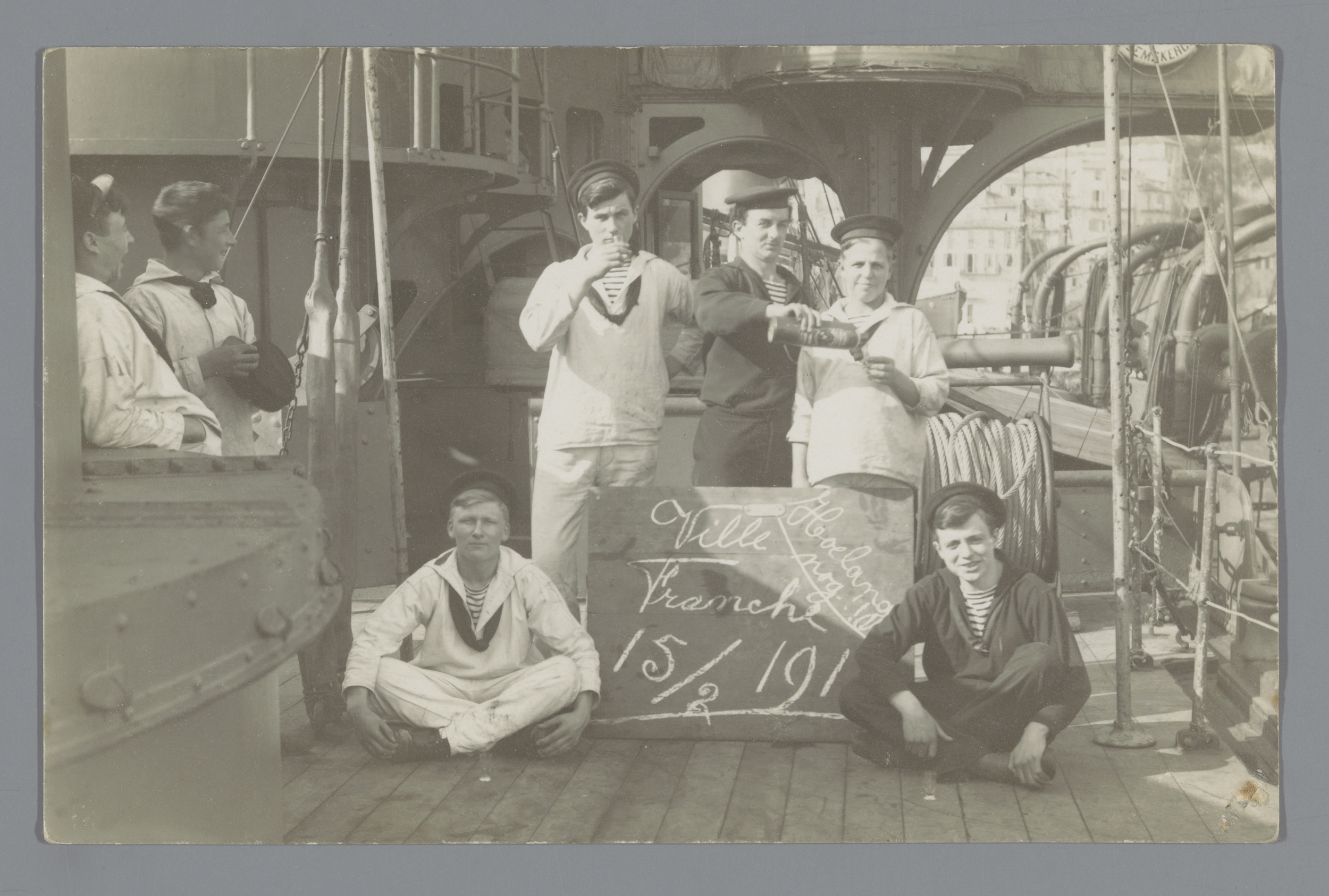 Groepsportret van vijf matrozen rond een bord op een...