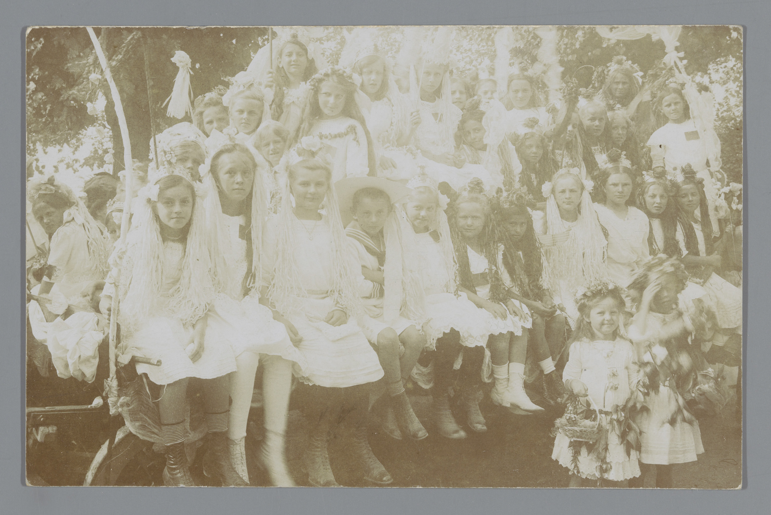 Groepsportret van verklede meisjes (vermoedelijk) vo...