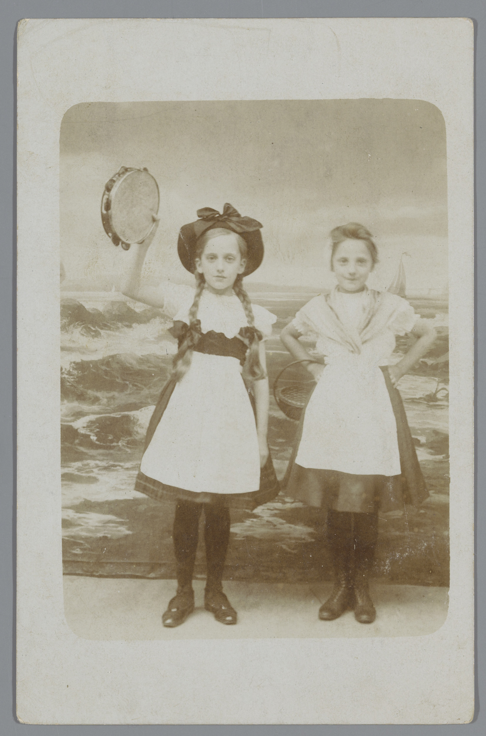 Studioportret van twee meisjes met een tamboerijn en...