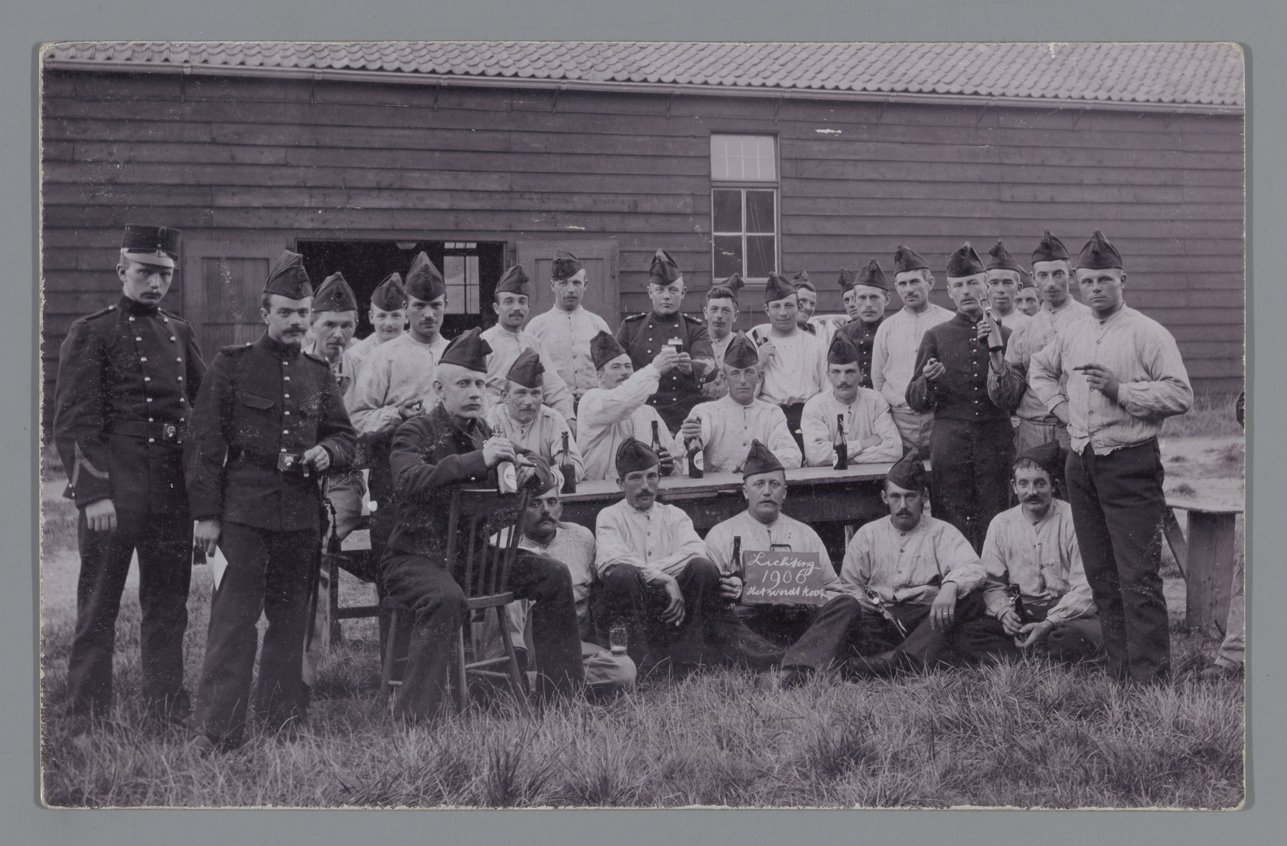 Groepsportret van onbekende mannen in uniform voor (...