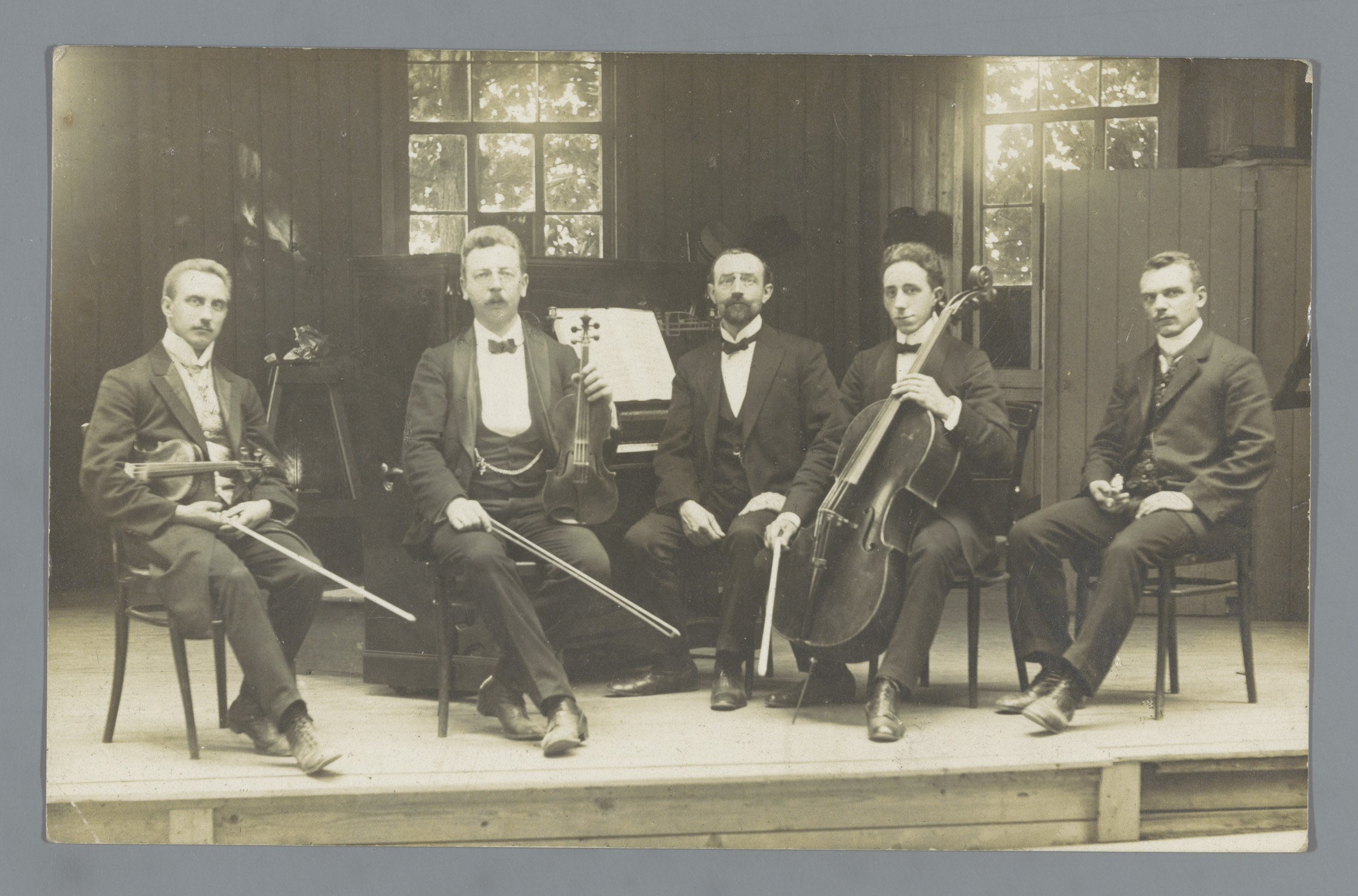 Groepsportret van een muziekensemble op een podium