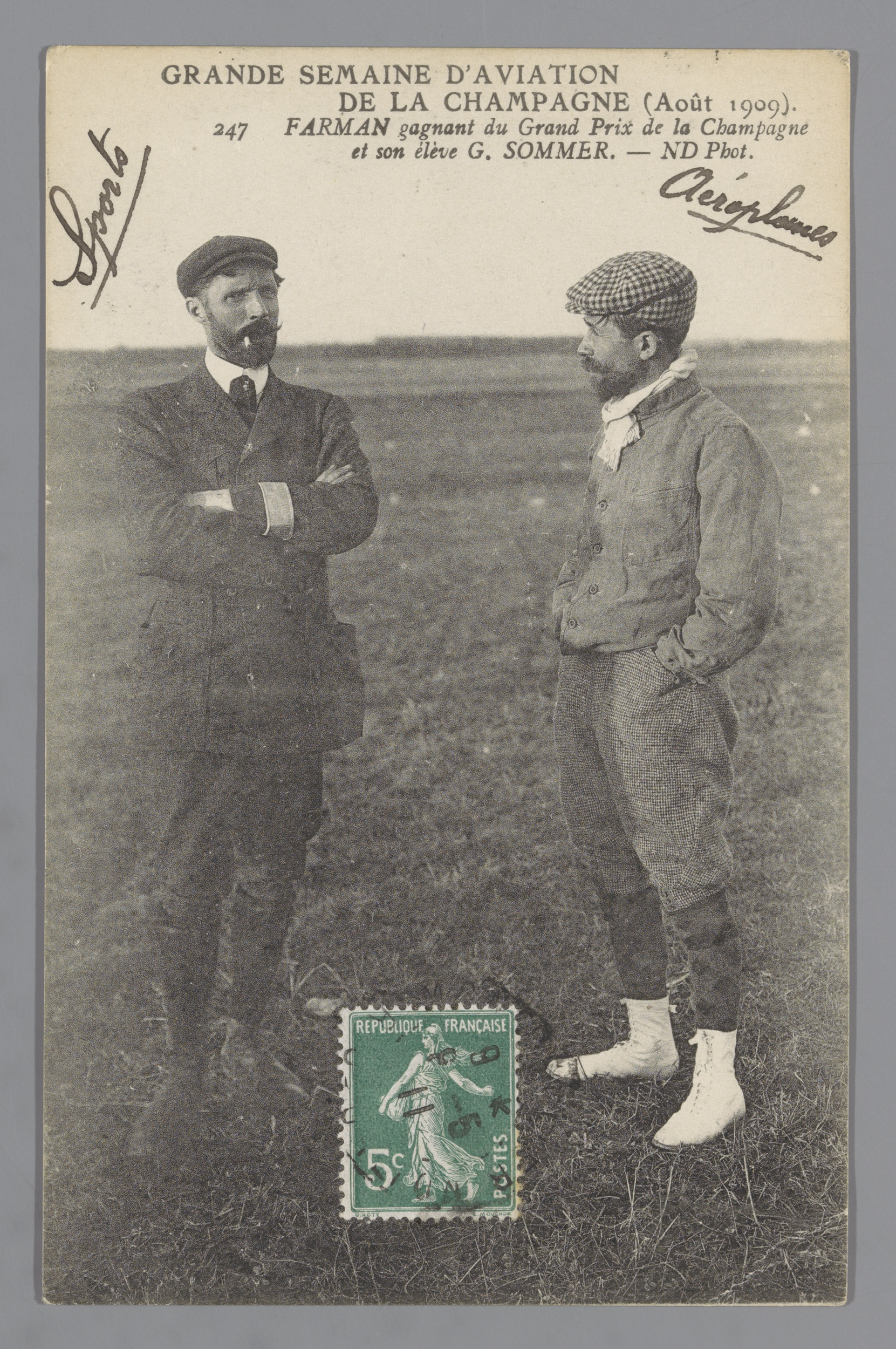 Portret van Henri Farman en Roger Sommer in een weiland