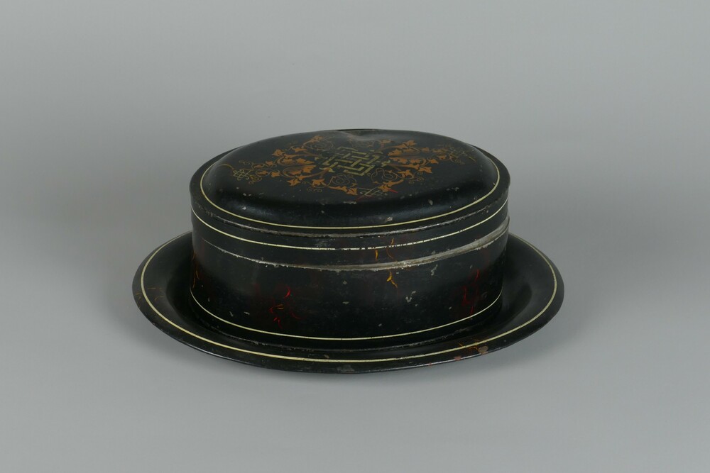 koekblik en schaal van blik, zwart gelakt, eind 19e ...
