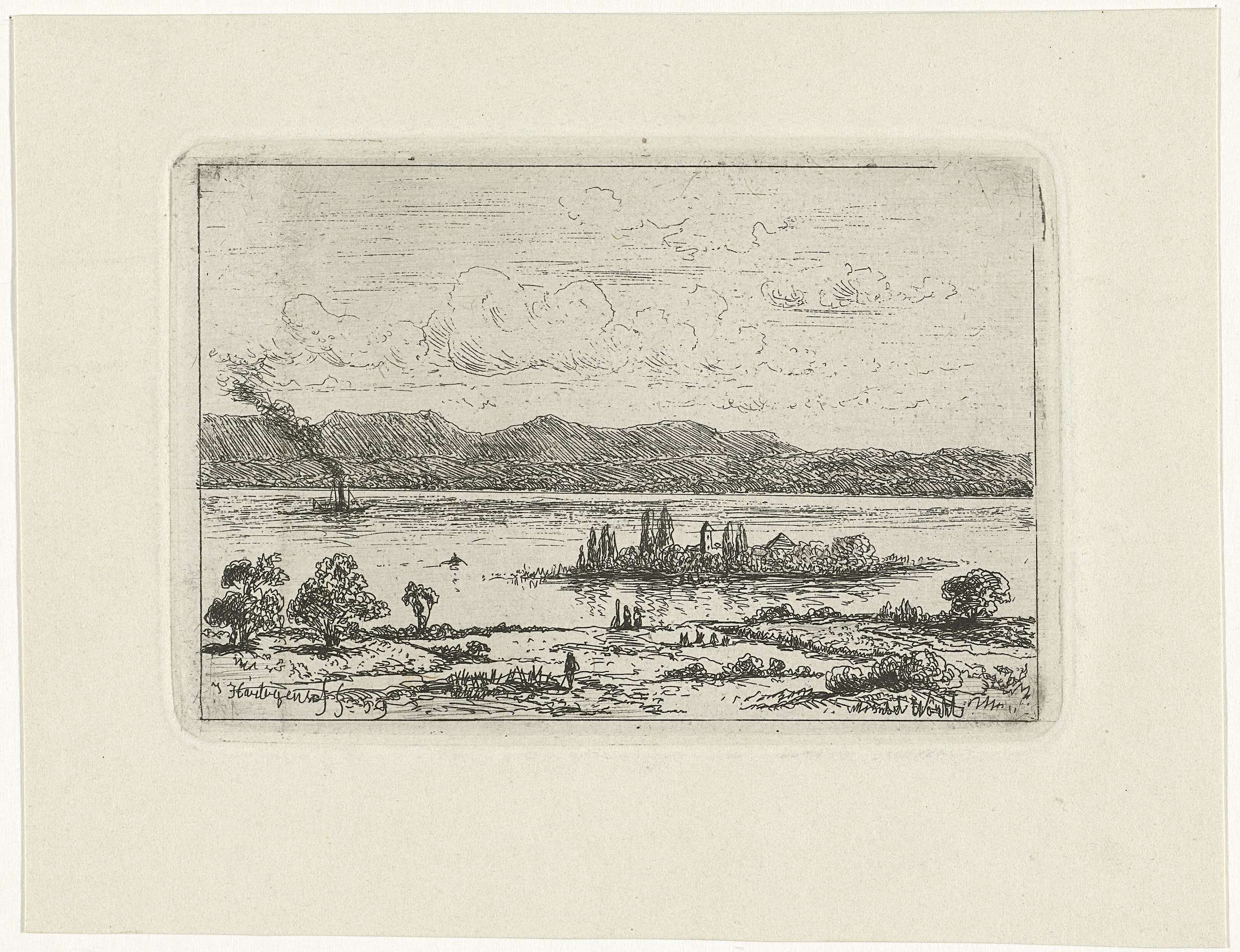 Rivierlandschap met zeilboot en bomen