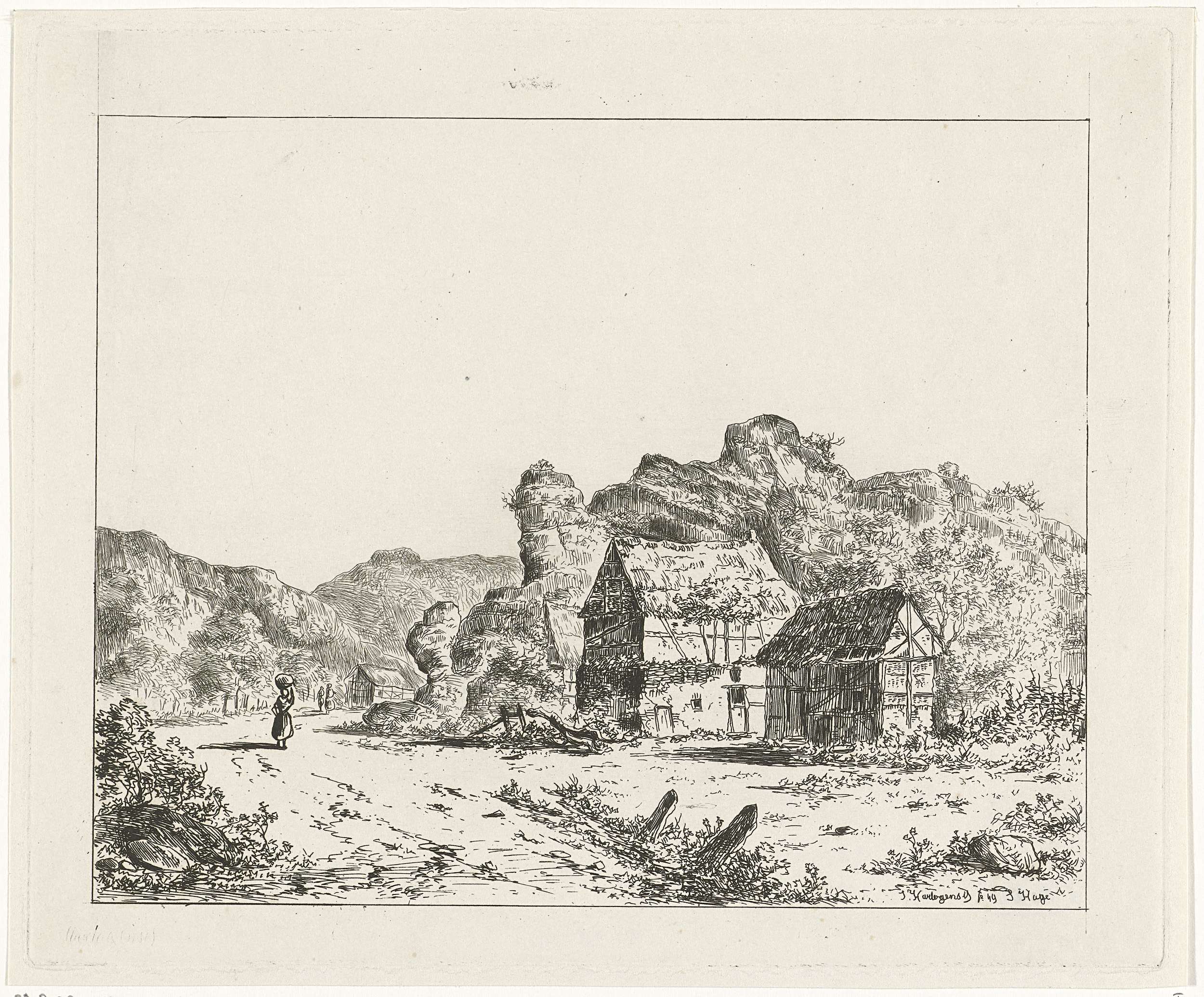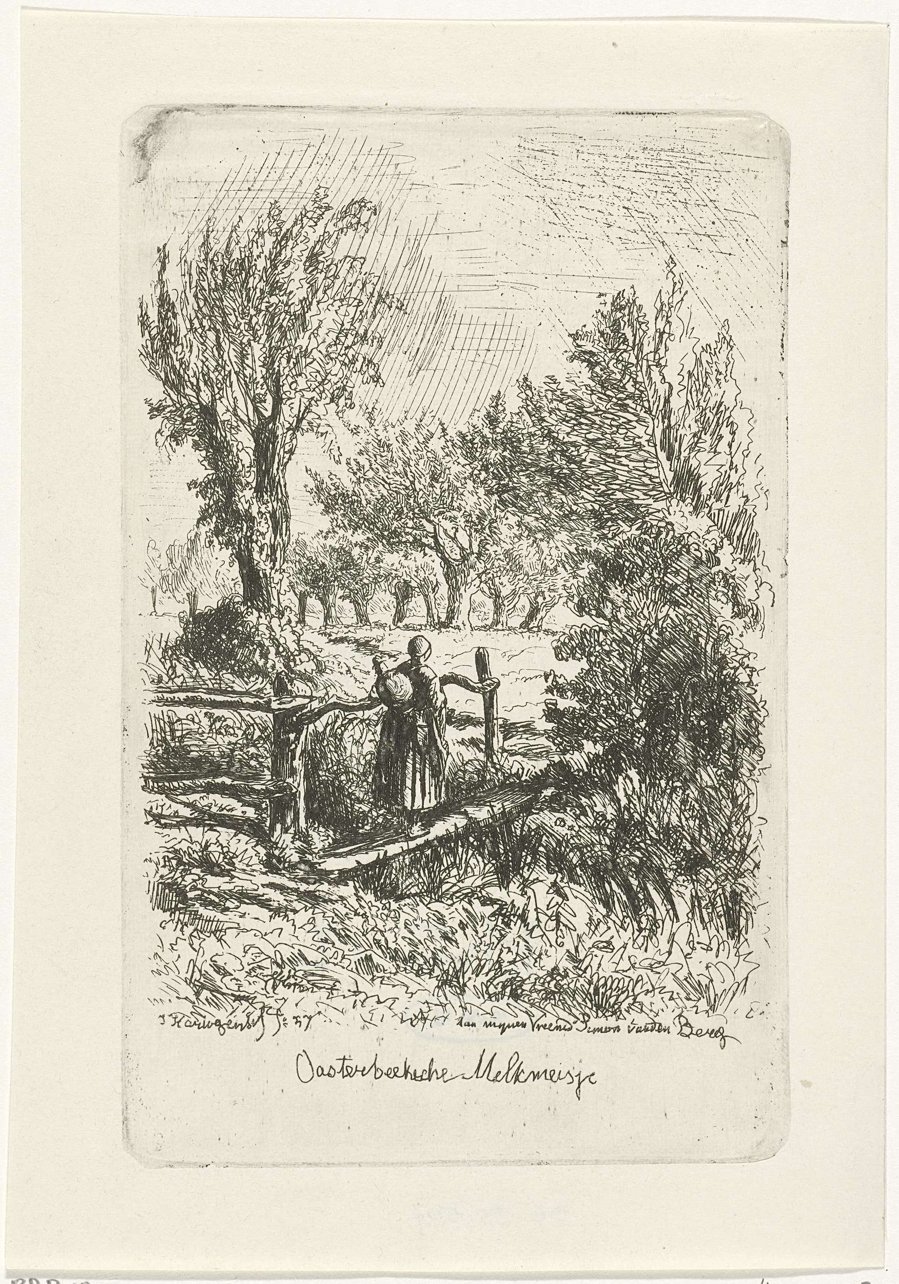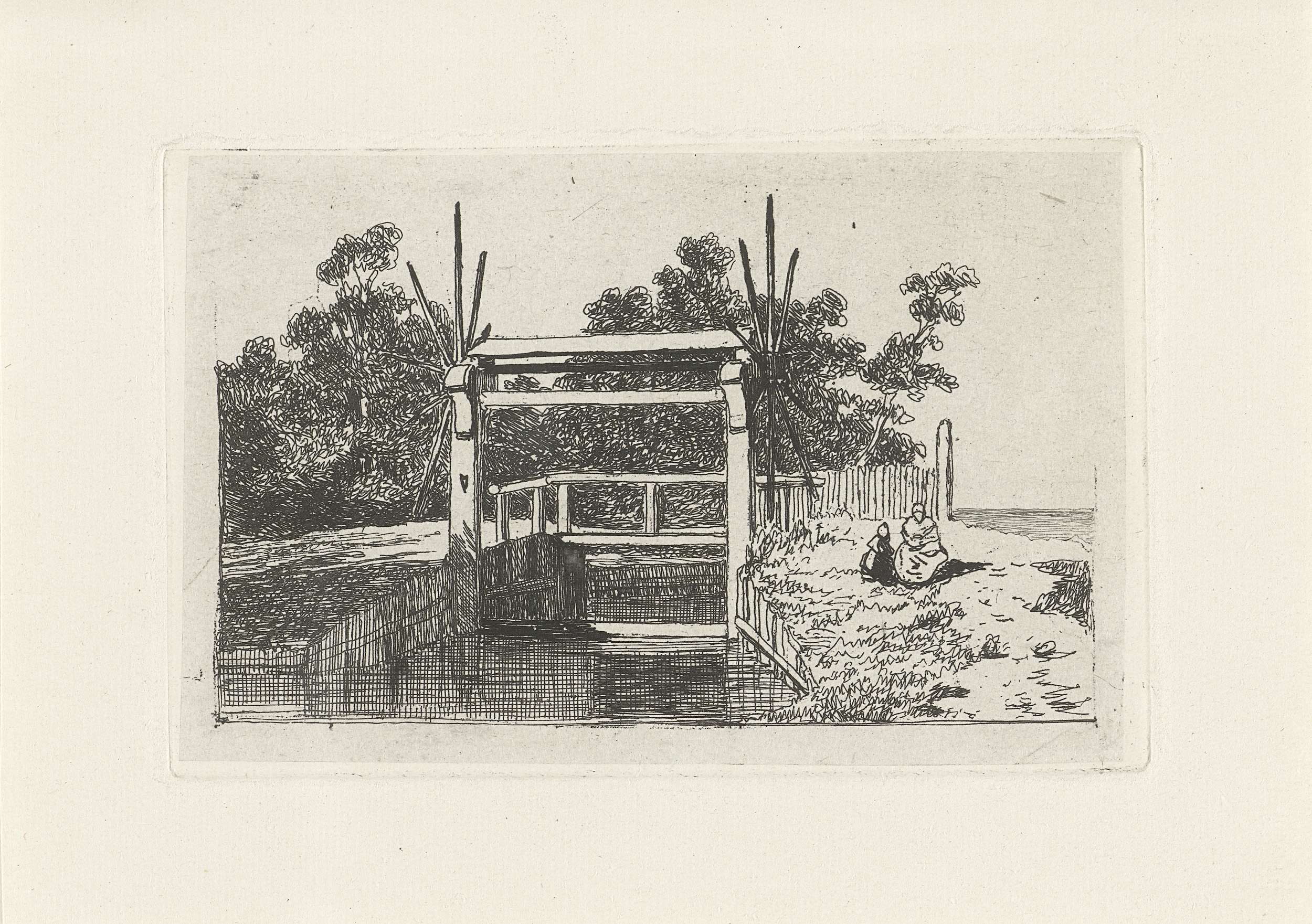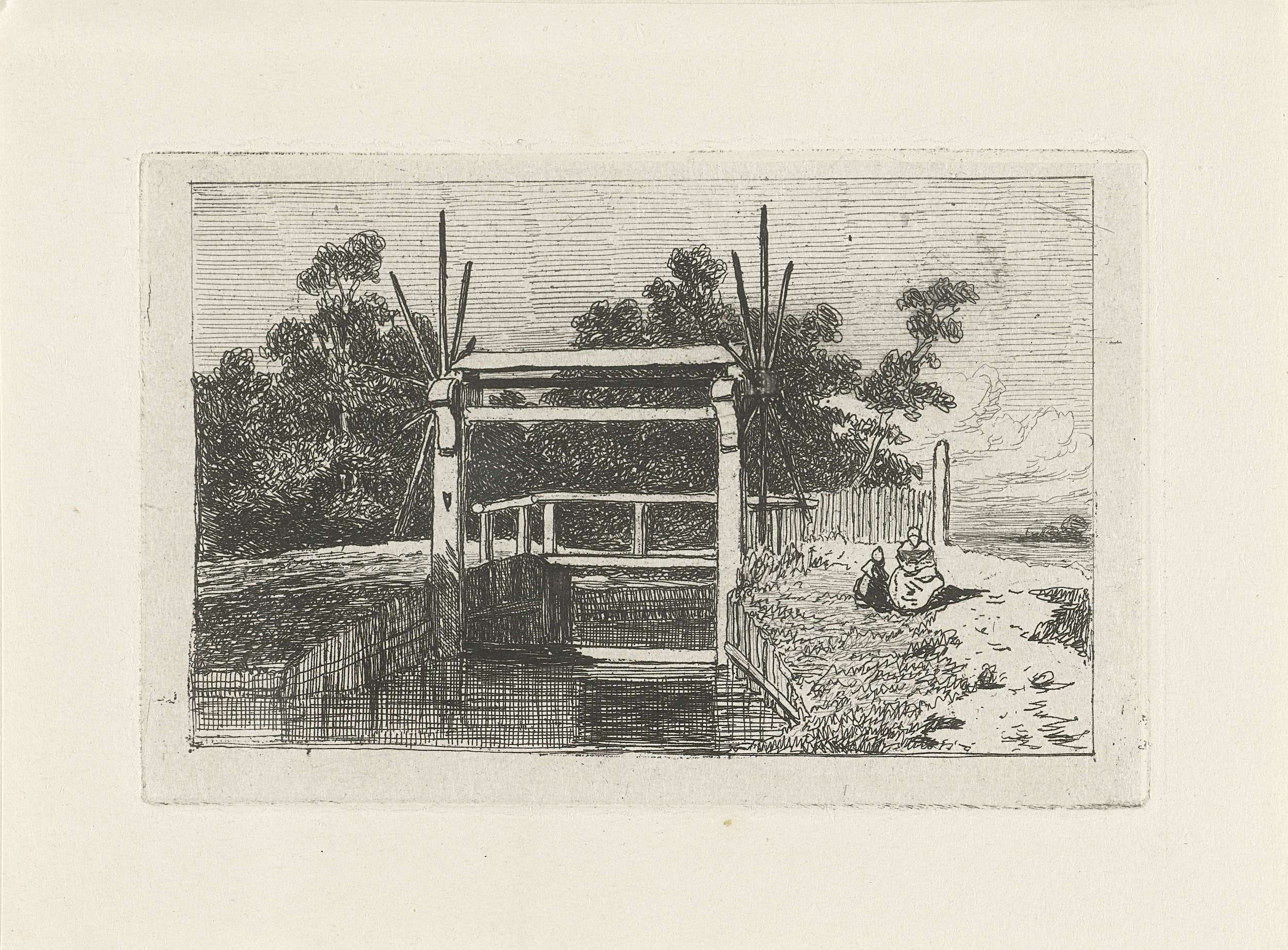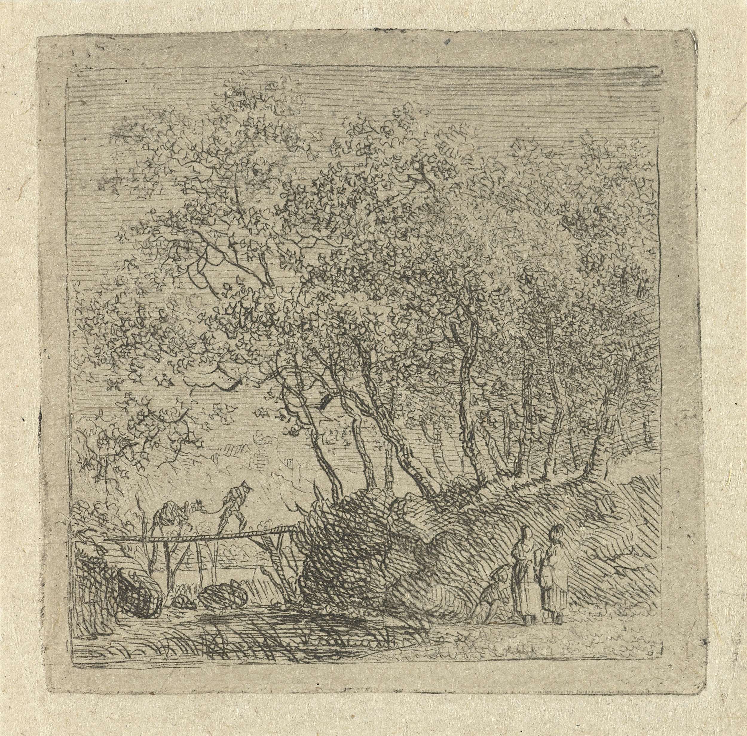 Landschap met man en ezel op een houten brug