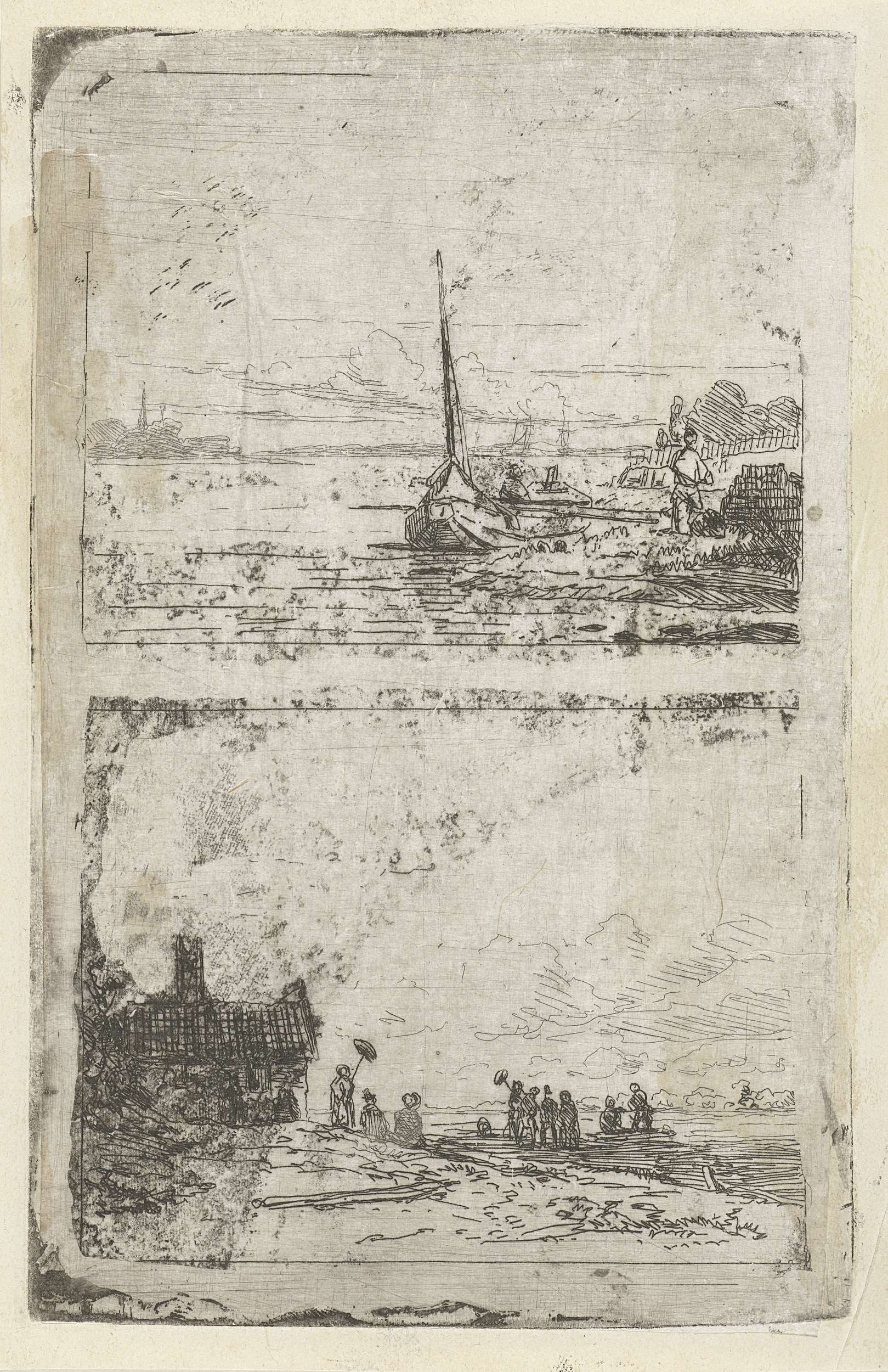 Twee voorstellingen: schip en gezelschap aan een oever