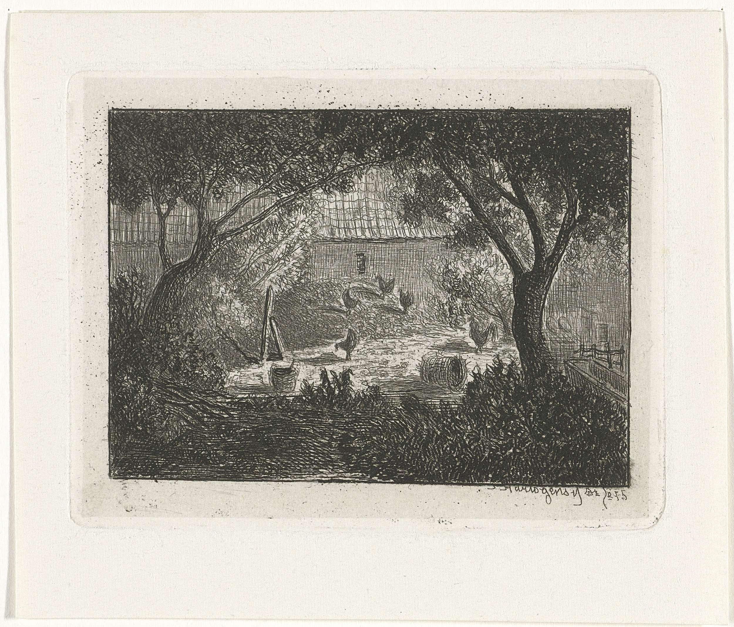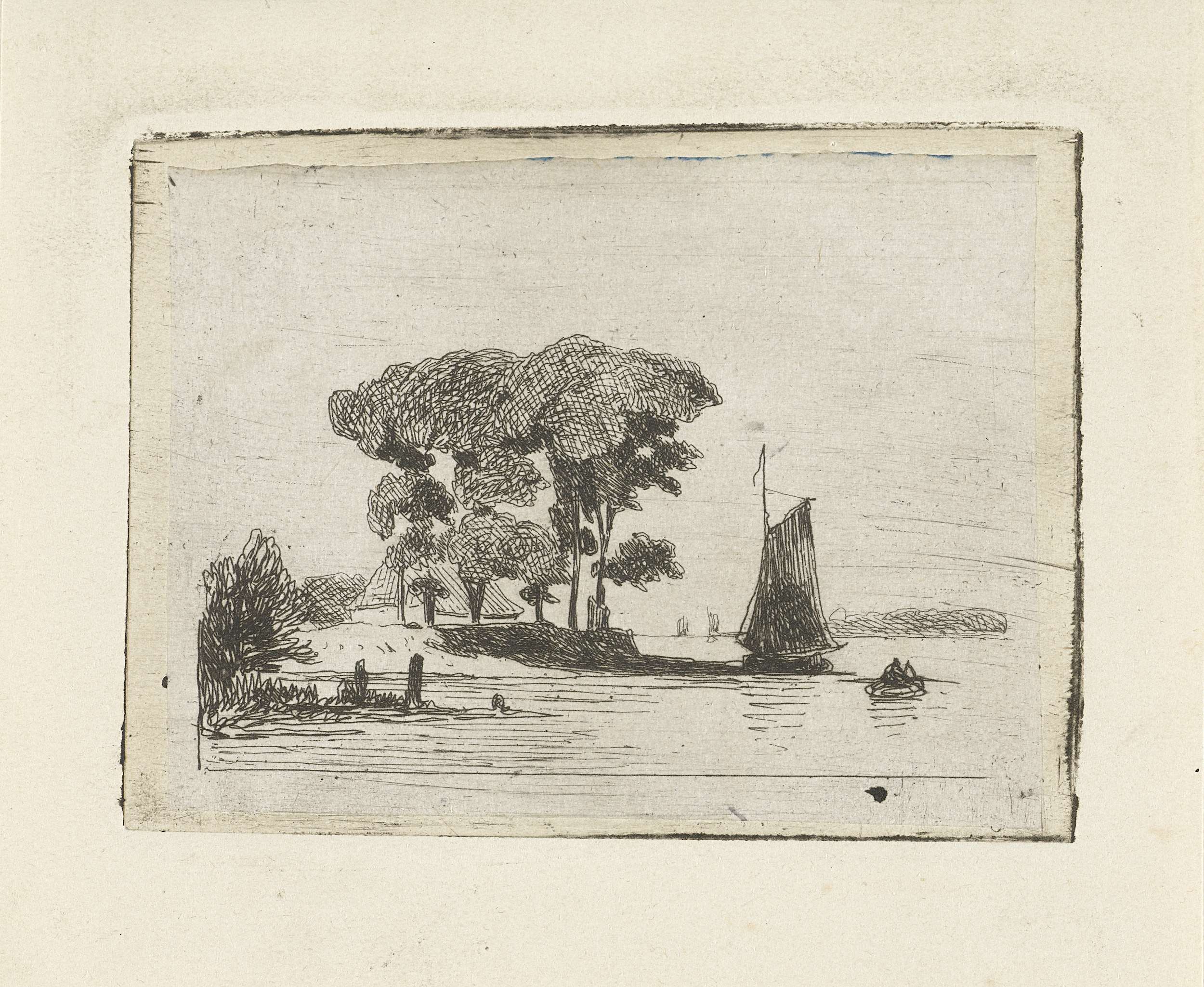 Rivierlandschap met zeilschip en bomen