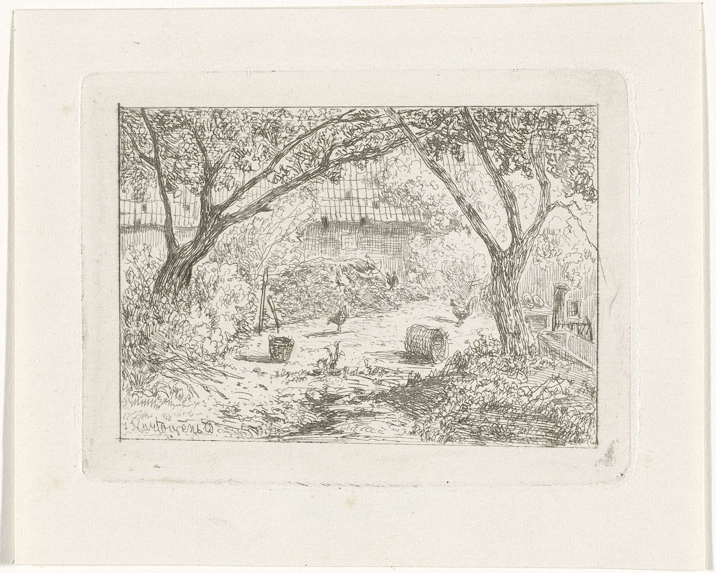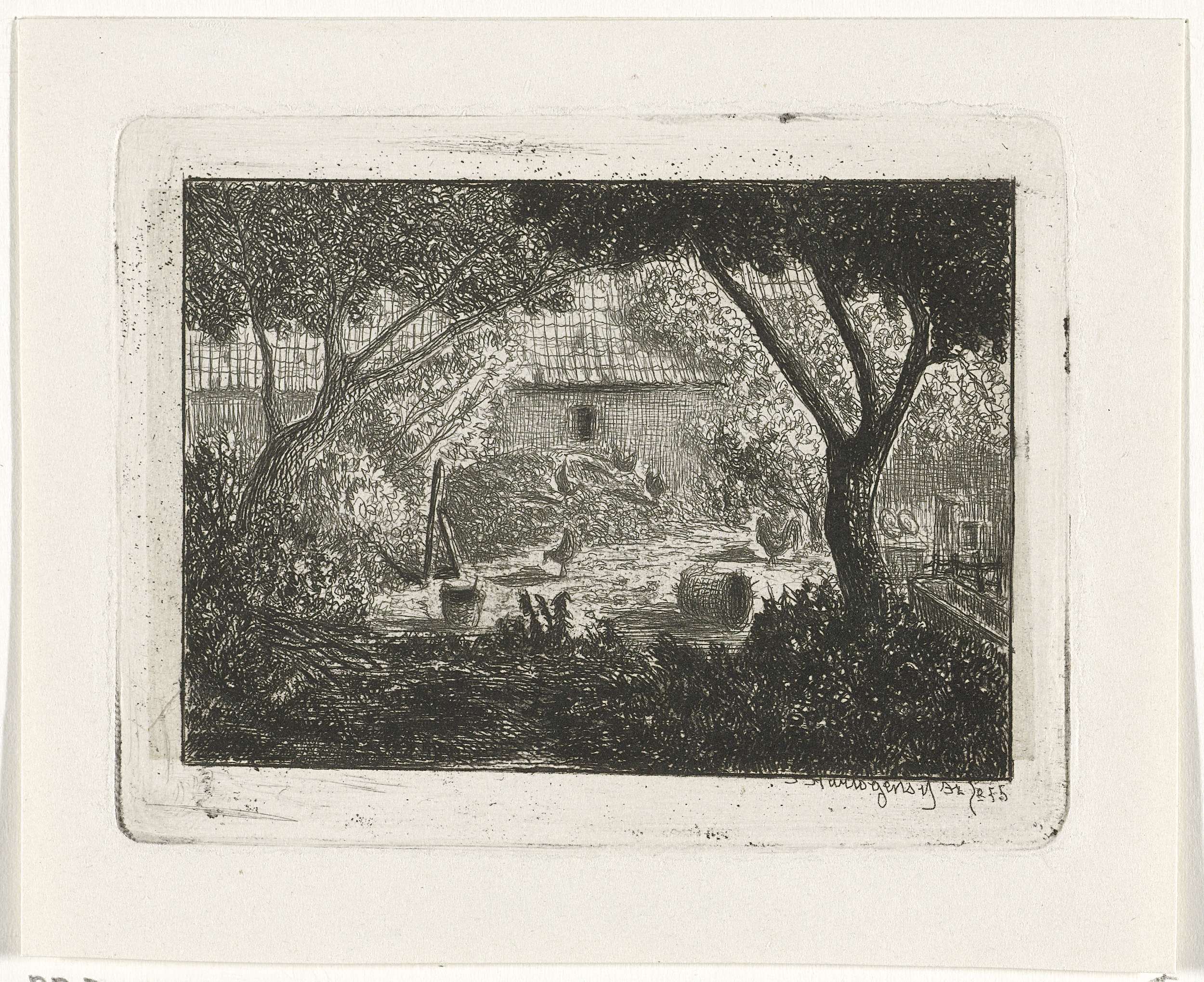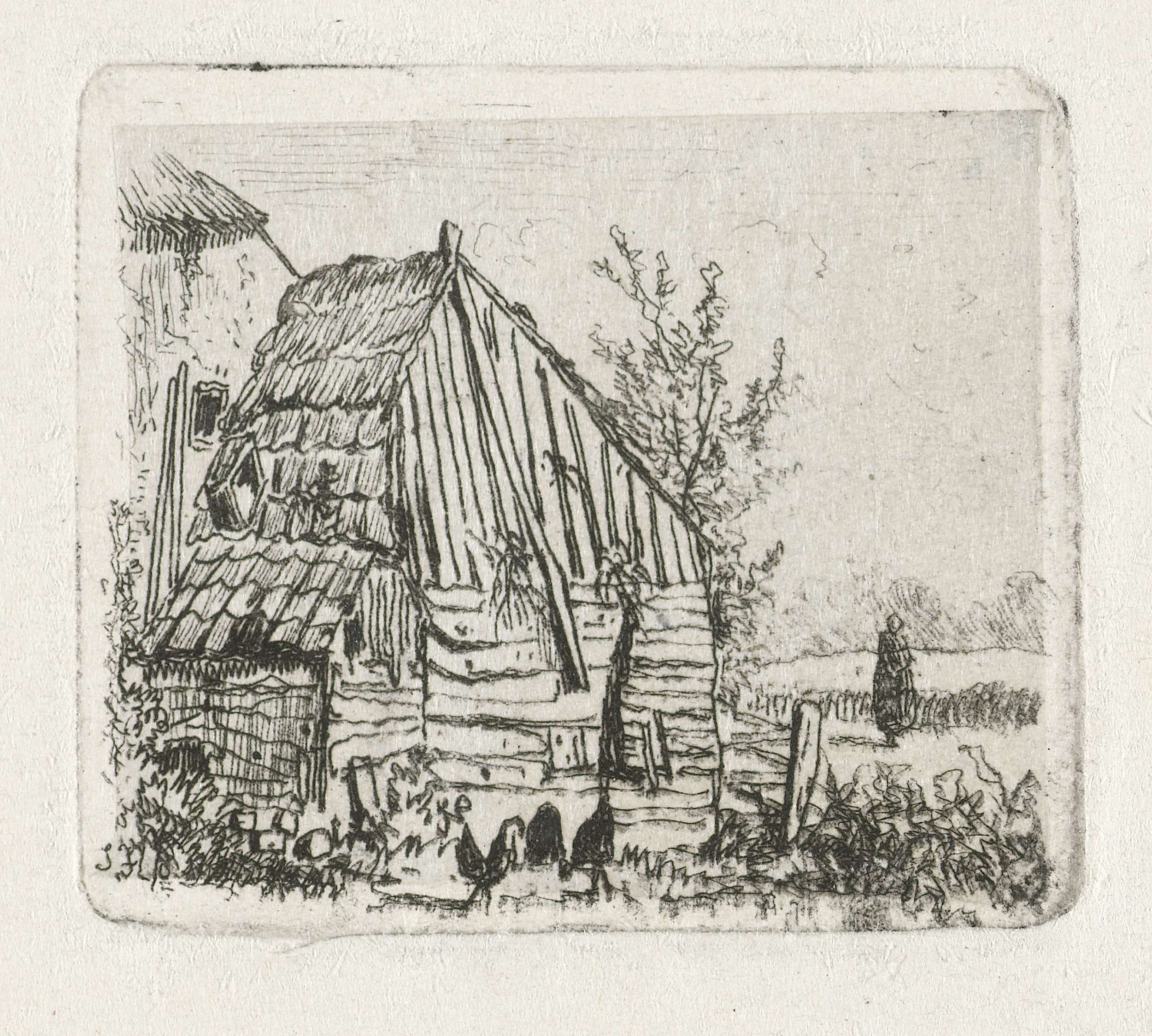 Man met hark bij een schuur