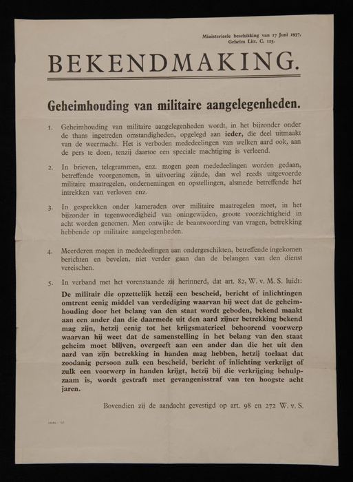 Pamflet met gedrukte bekendmaking aangaande geheimho...