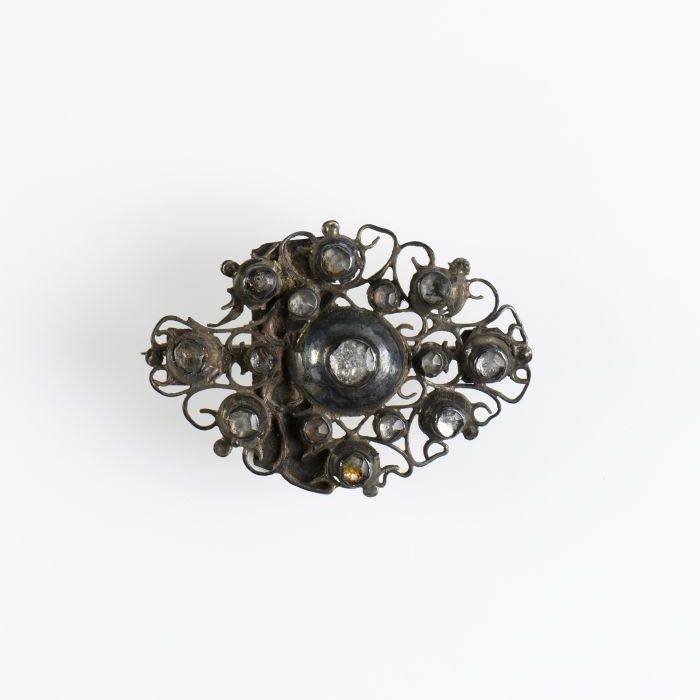 Broche, clip van zilver, bezet met (half-)edelsteentjes