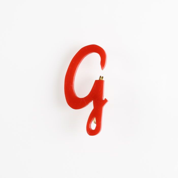 Rood plastic kinderbroche, voorstellend hoofdletter "G"