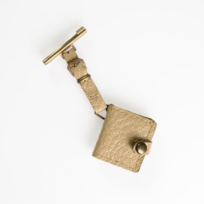 Koperen kinderbroche, waaraan leren riempje en leren...