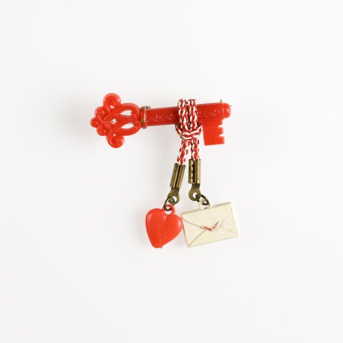 Kinderbroche, rode plastic sleutel, met twee rood-wi...