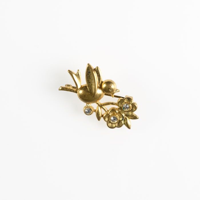 Gouden broche met sierspeld aan kettinkje, en drie g...