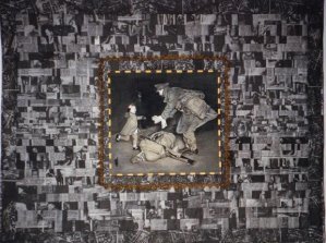 Kunstwerk, quilt, vader en kind door T. v.d. Wal