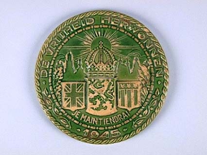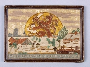 Tegel met tekst, 5 Mei 1945. Nederland vrij van