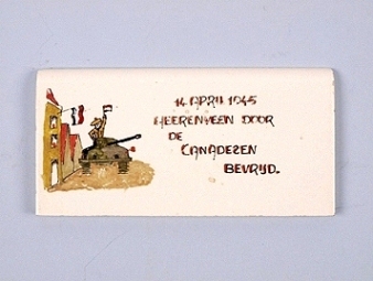 Tegel met tekst, 14 April 1945 Heerenveen door