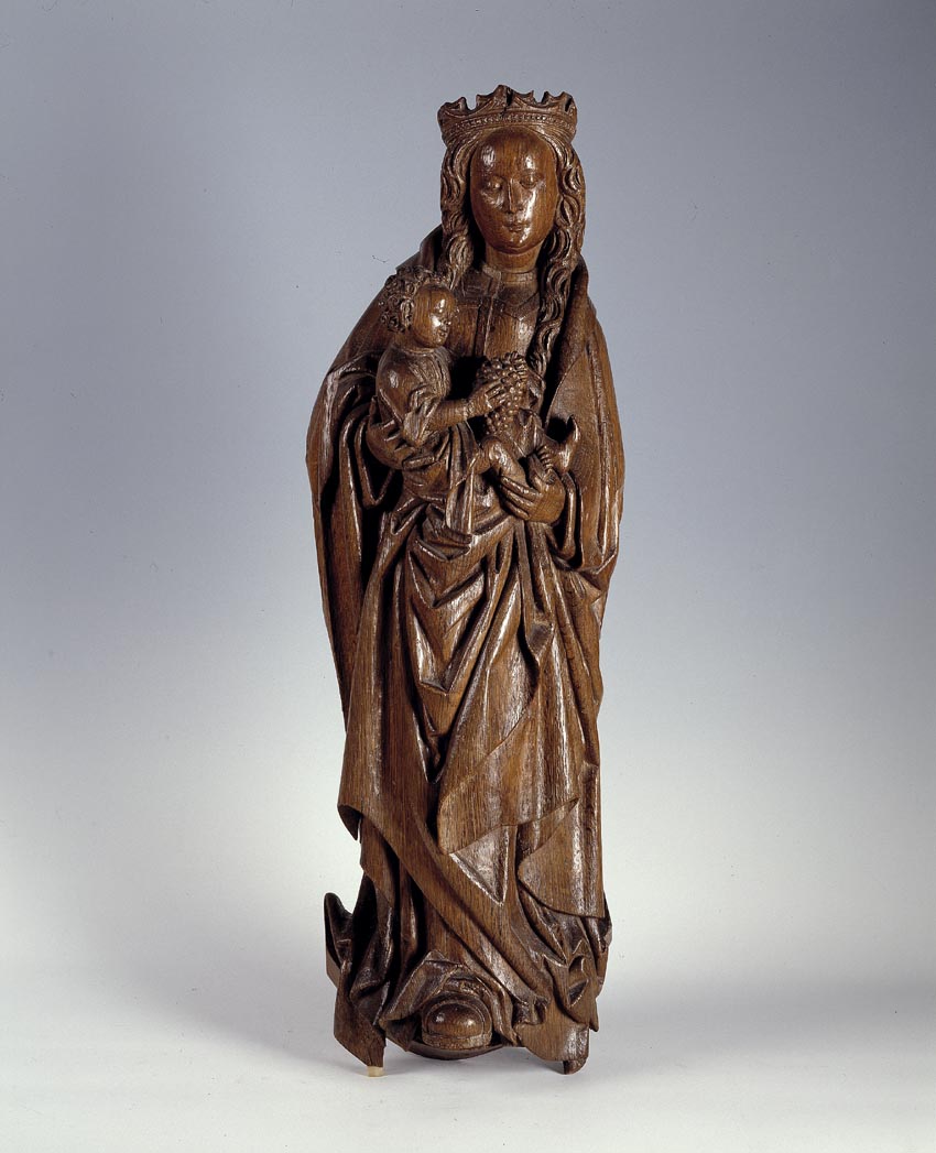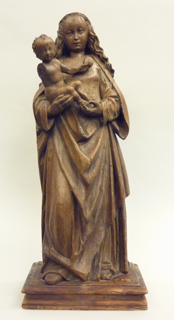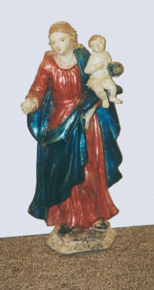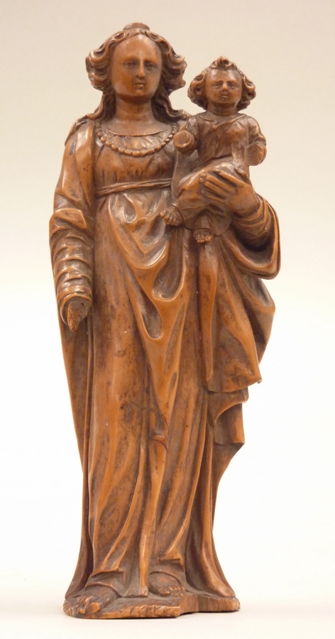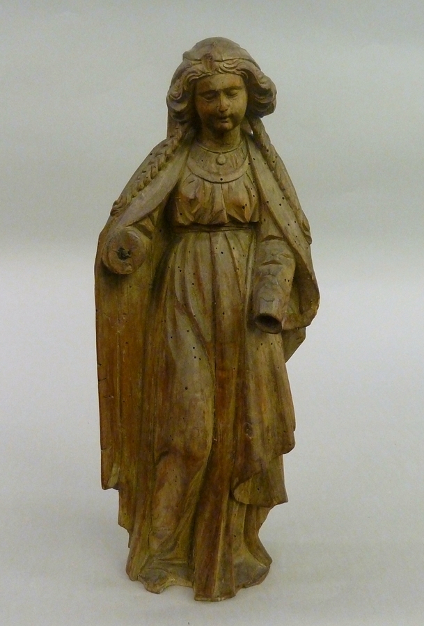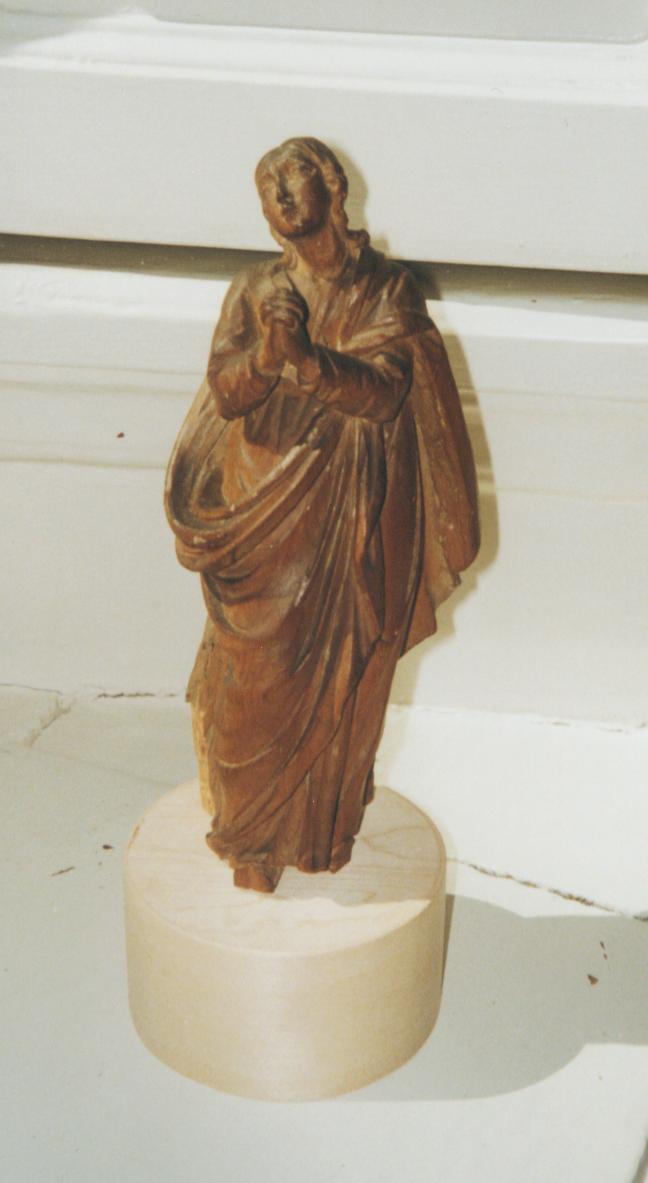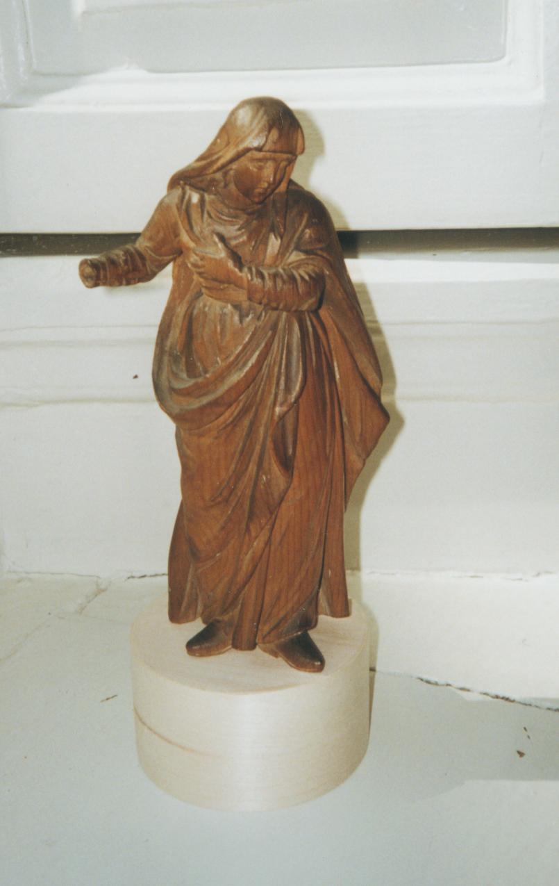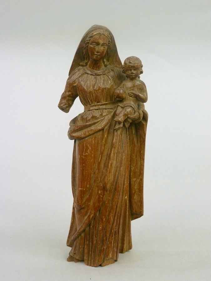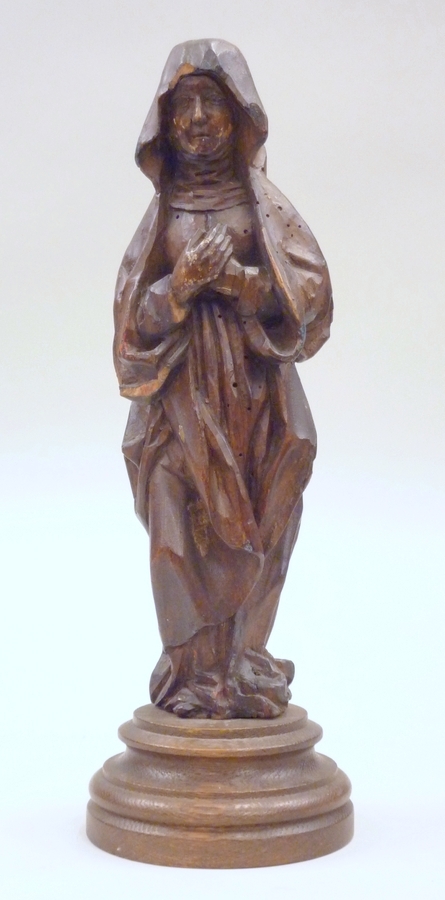 Maria, staande, met hoofddoek, kinlap, mantel, eens ...