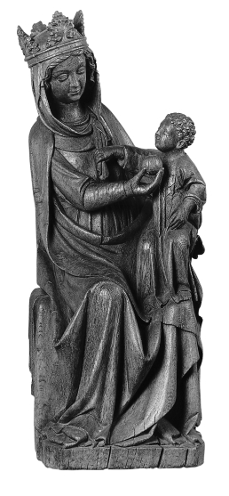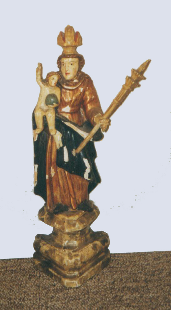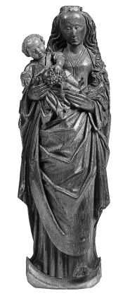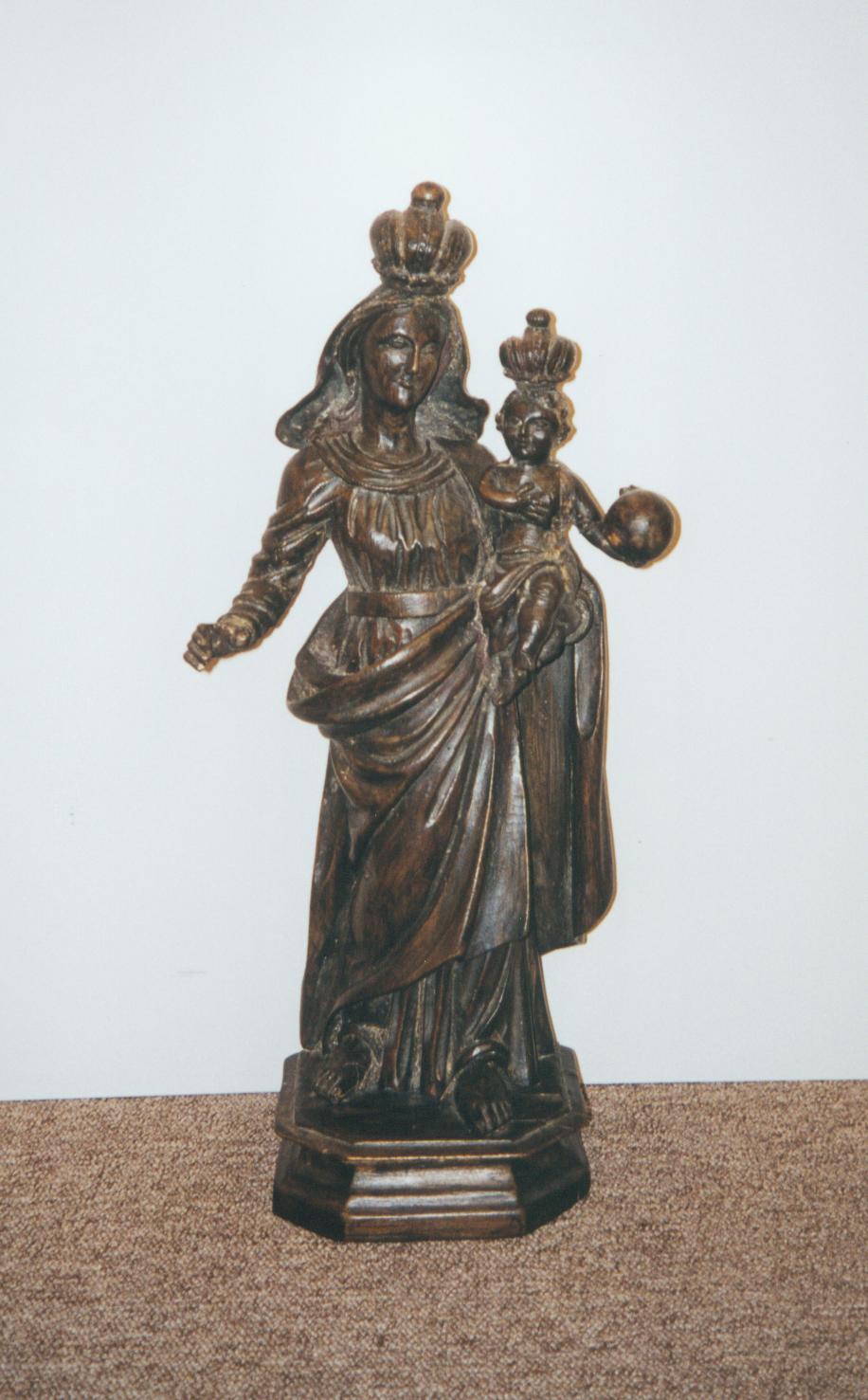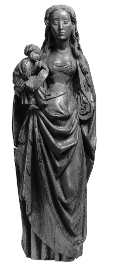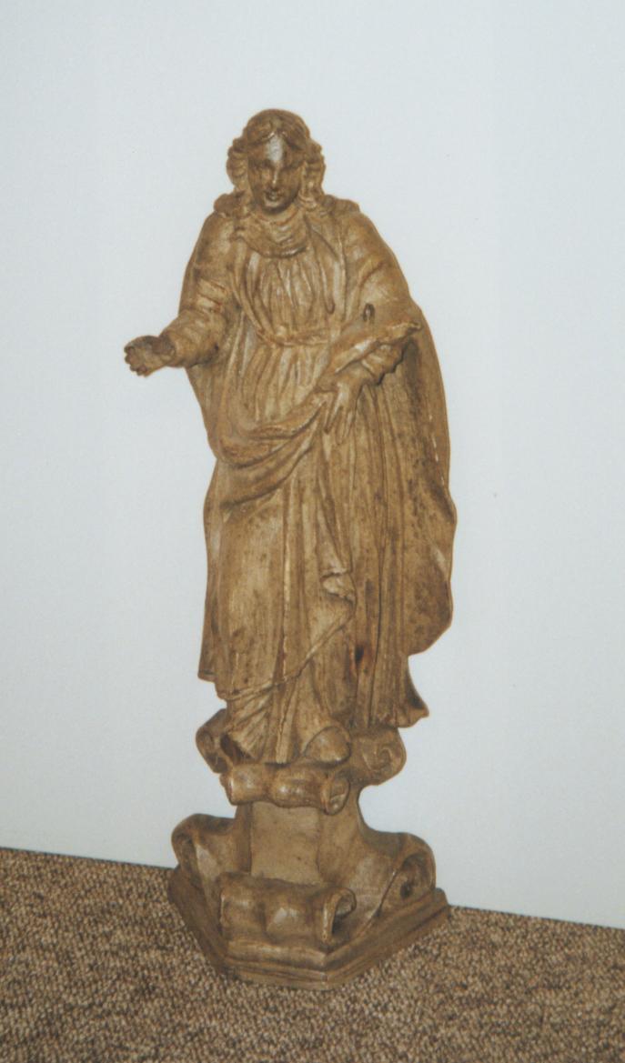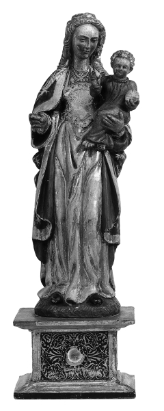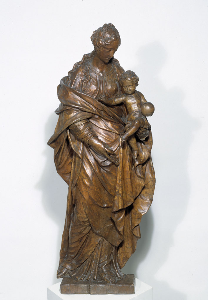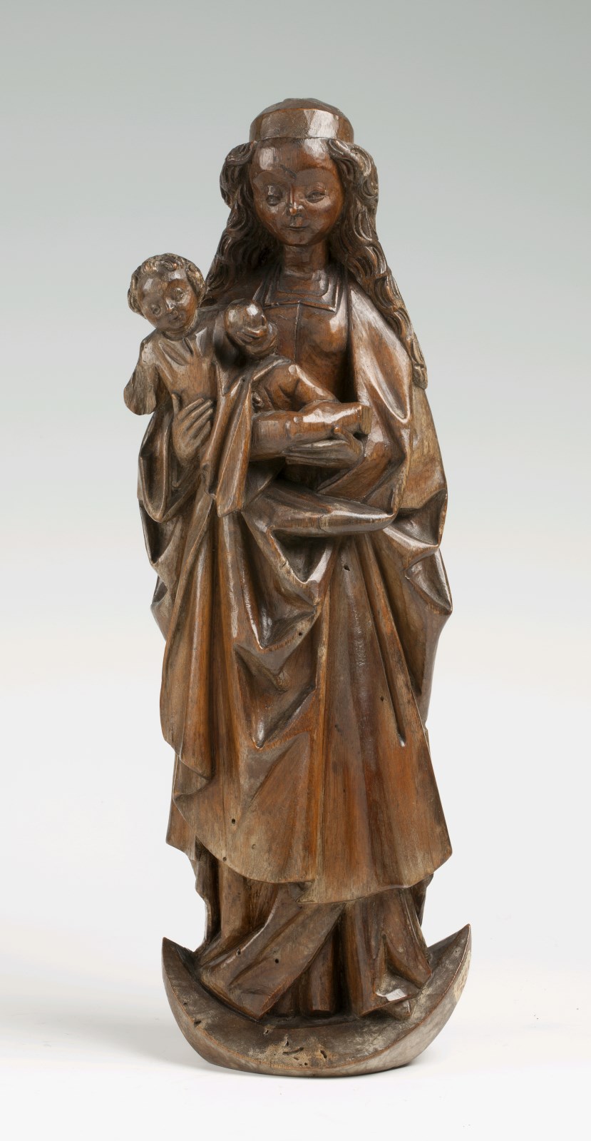 Maria, staande, met hoofddoek, kinlap, mantel, eens ...