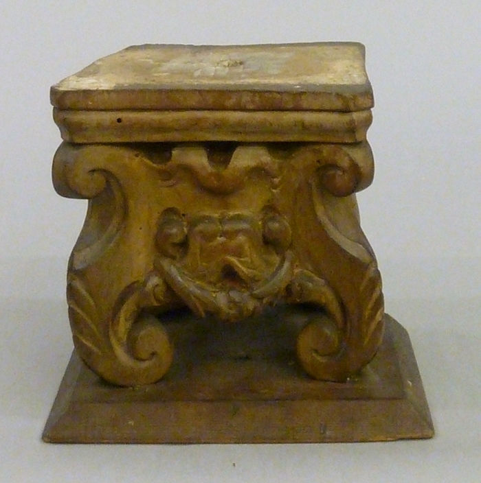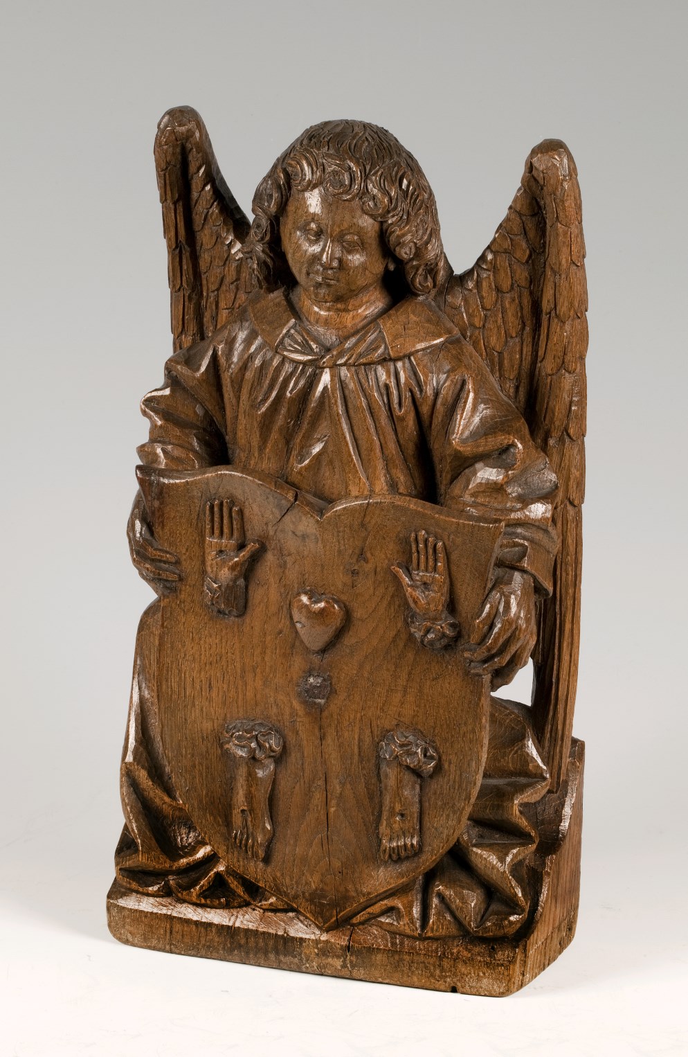Cherubkopje, eronder een rond schild met "Charitas",...