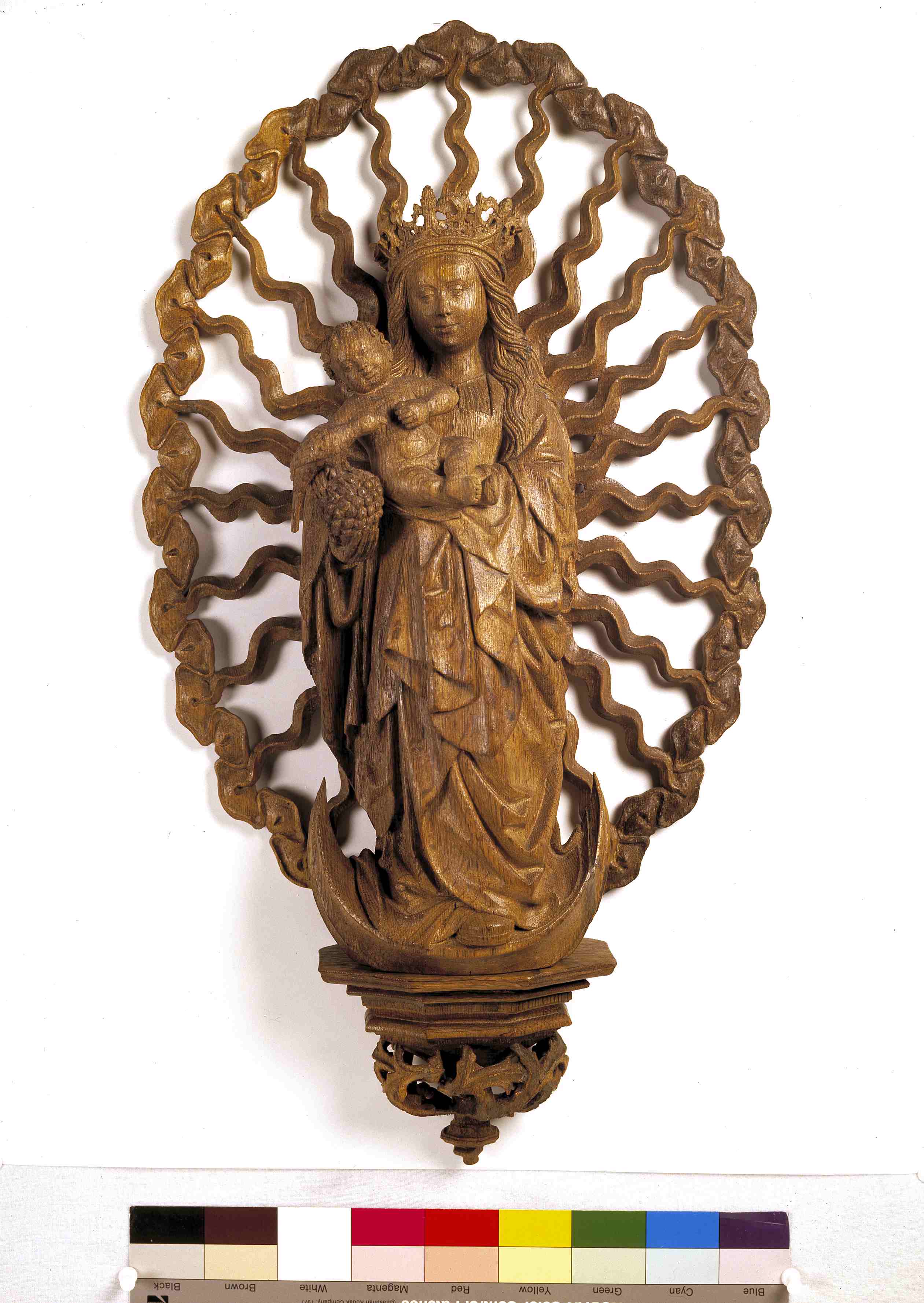Maria, handen voor de borst samengevouwen, op ronde ...