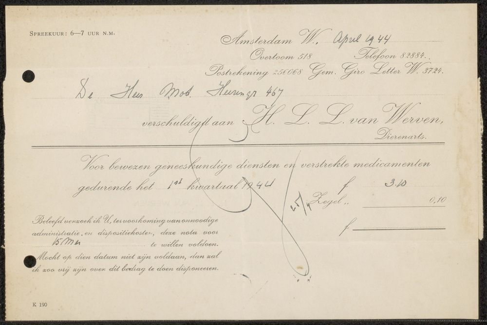 Rekening van Dierenarts H.L.L. van Werven Amsterdam