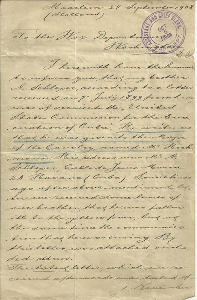 Van G. Schleper aan het War-Department USA betreffen...