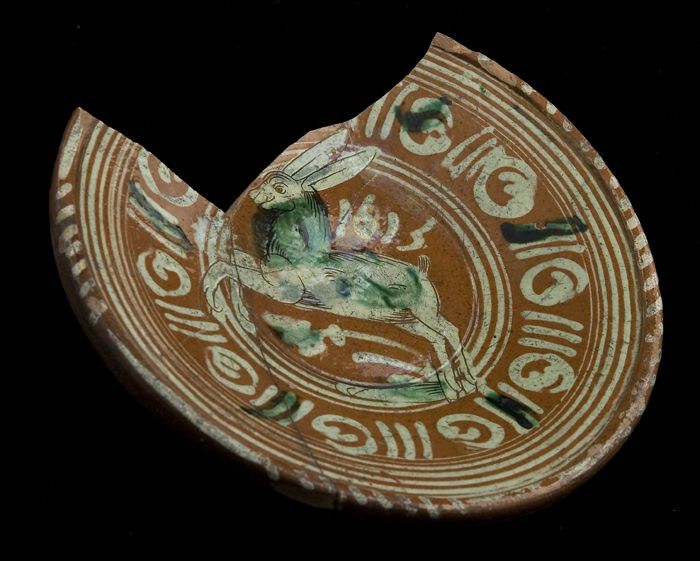 Fragment Werra bord, spiegeldecor haas, jaartal "160...