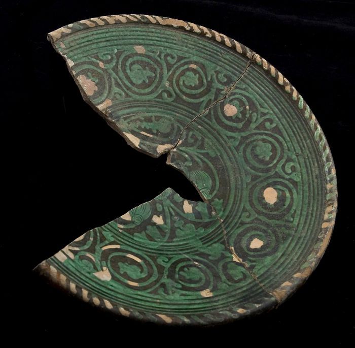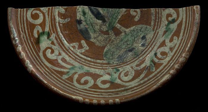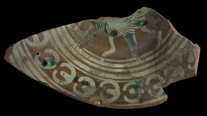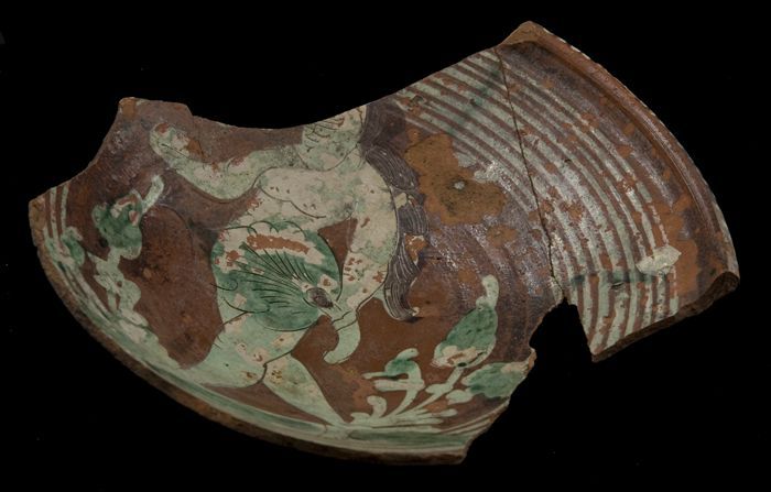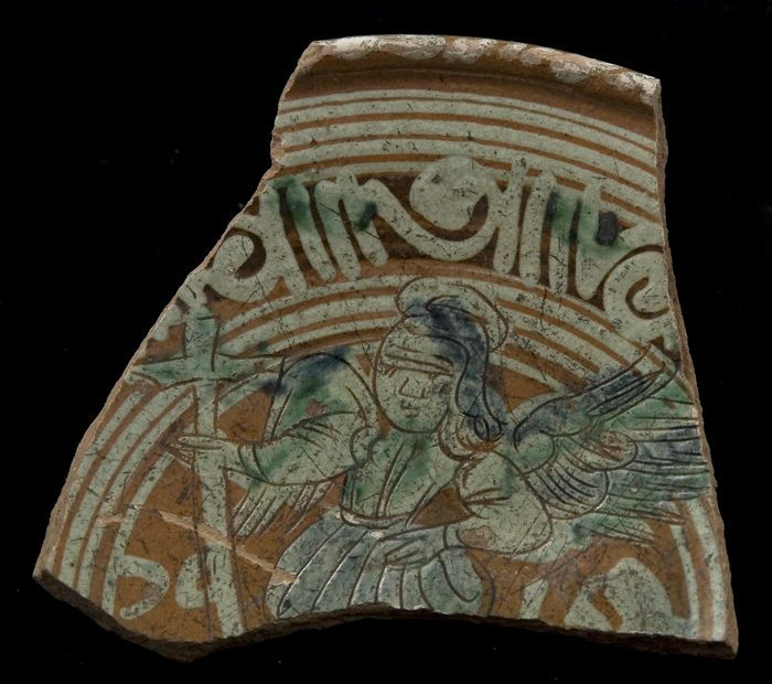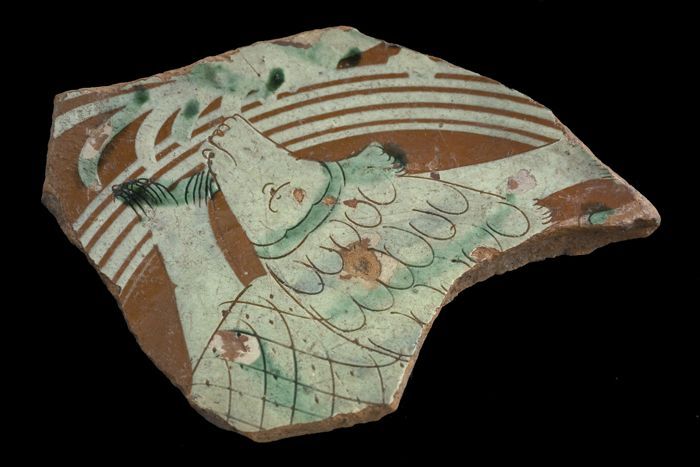 Fragment Werra kom, spiegeldecor met vogel, lichtgee...