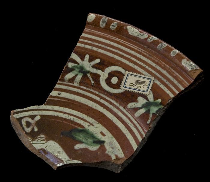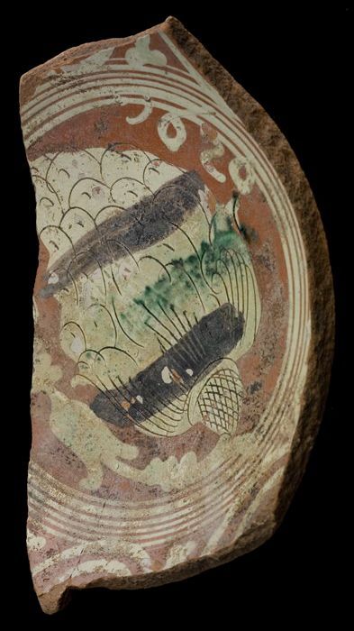 Bodemfragment Werra kom, spiegeldecor met vis en jaa...
