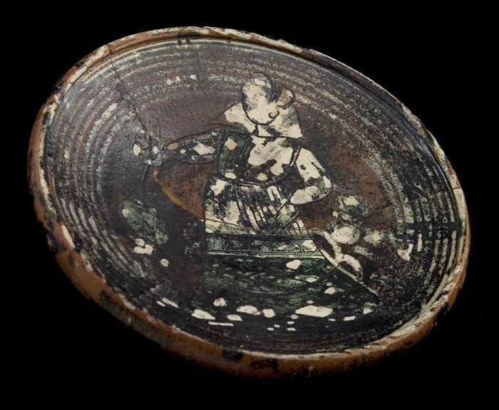 Fragmenten Werra bord, spiegeldecor Eva met appel in...