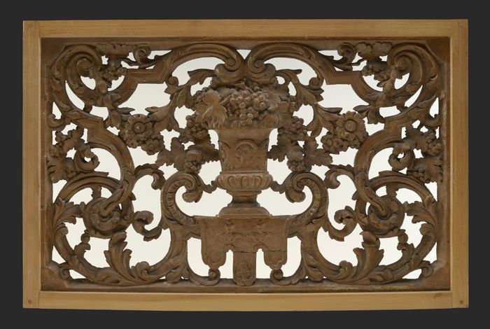 Bovenlicht met in hout gesneden antieke vaas met dru...