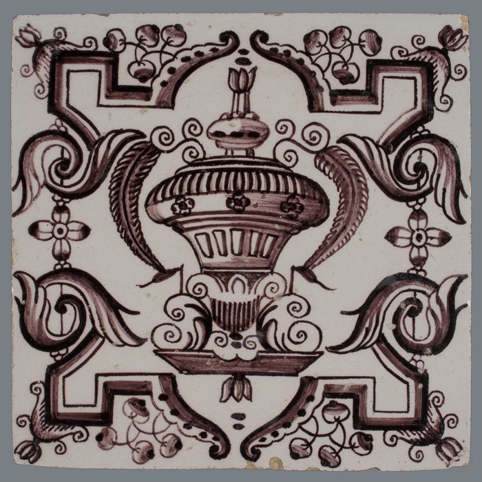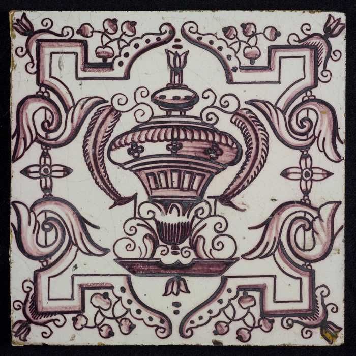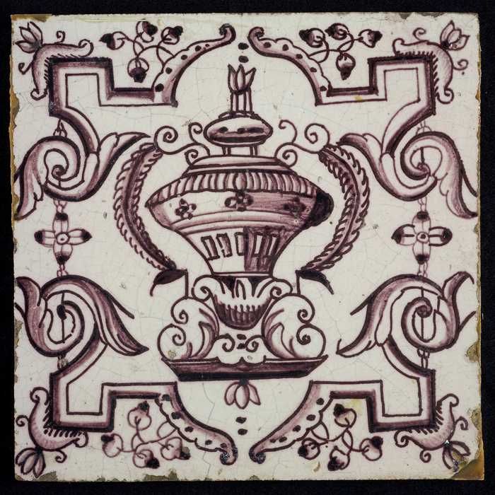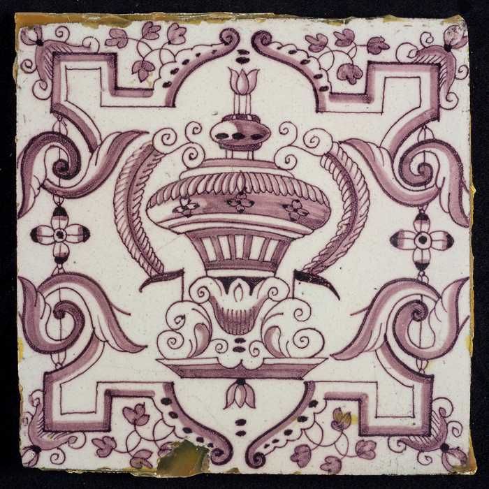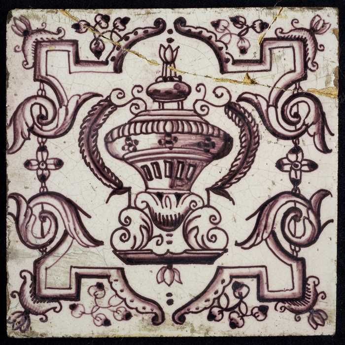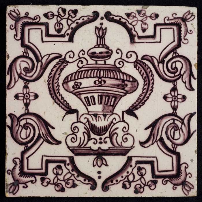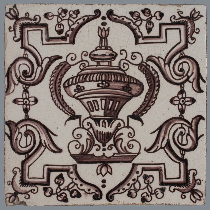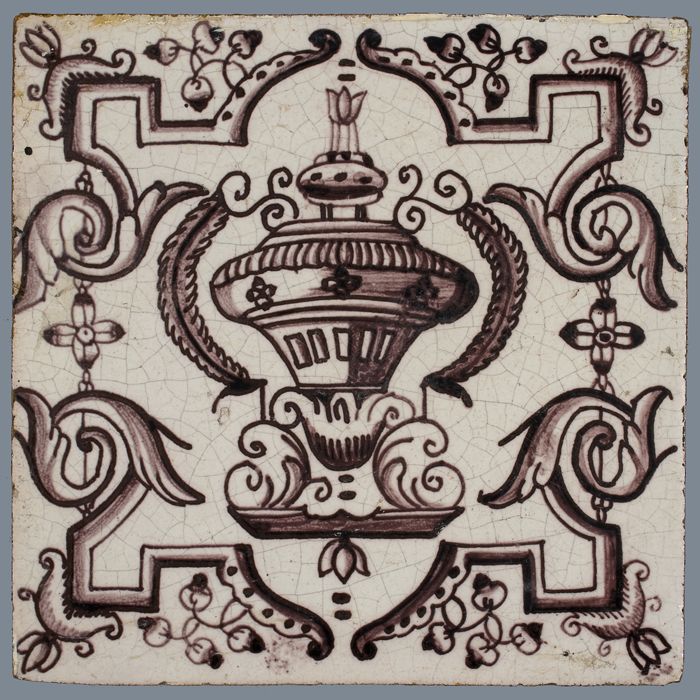 Ornamenttegel, bloempjes met streepjes, hoekmotief g...