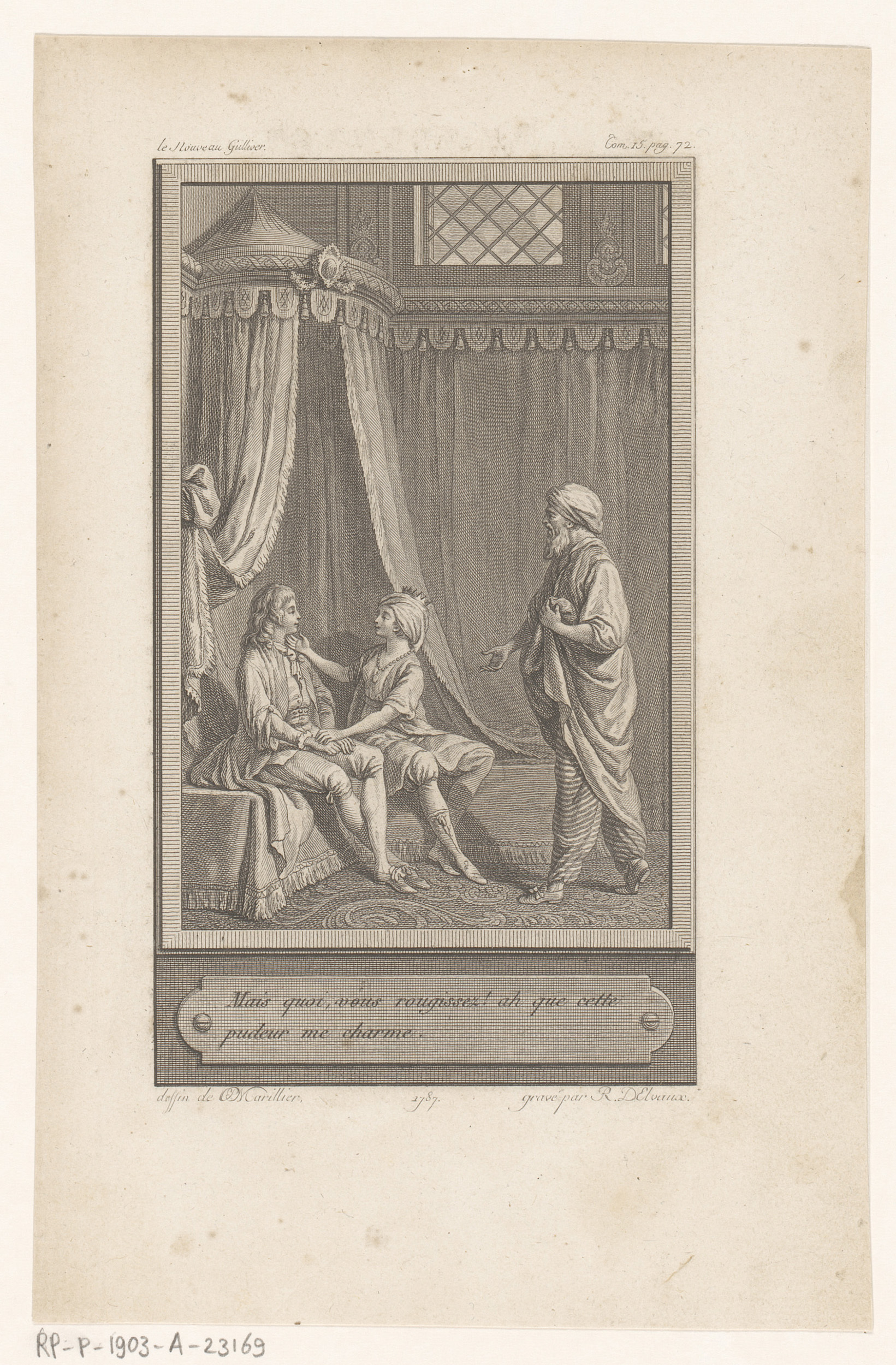 Man en vrouw op een hemelbed benaderd door een oude ...