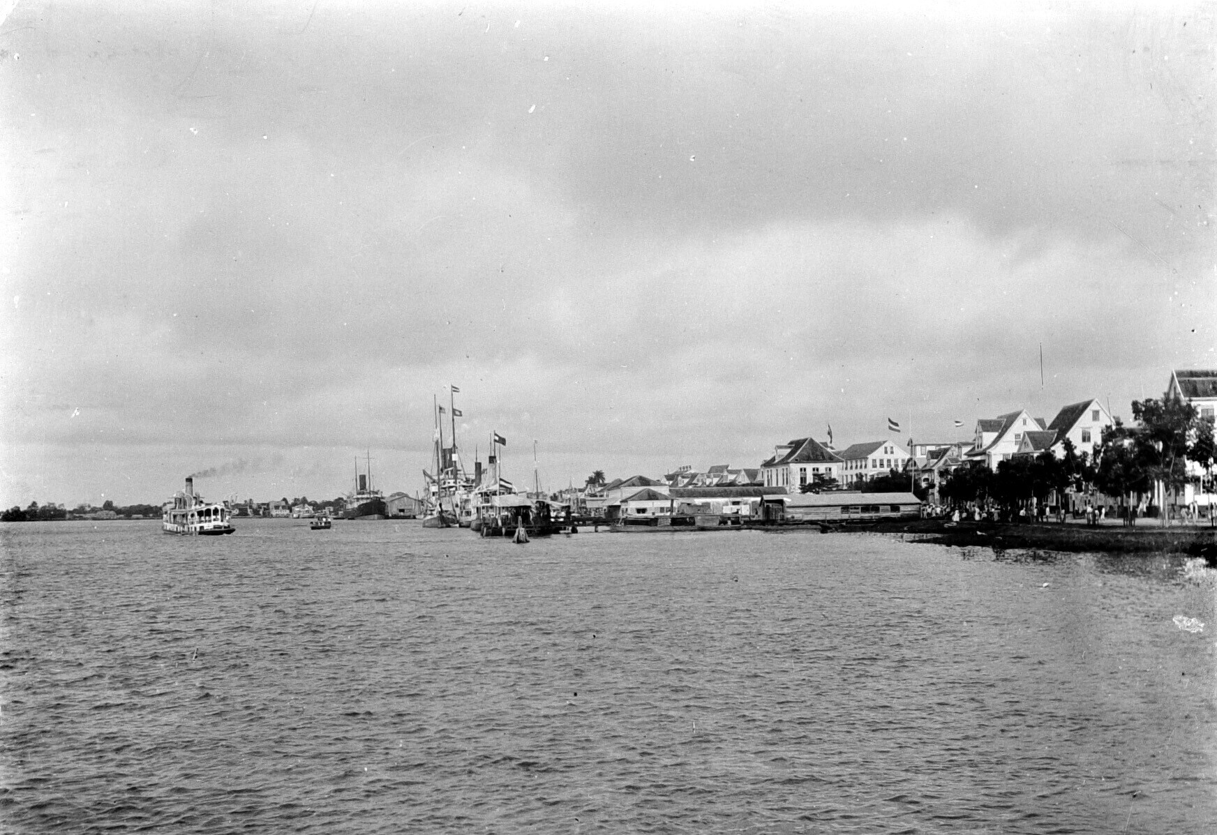 Zicht over de Suriname rivier met opgetuigde boten b...
