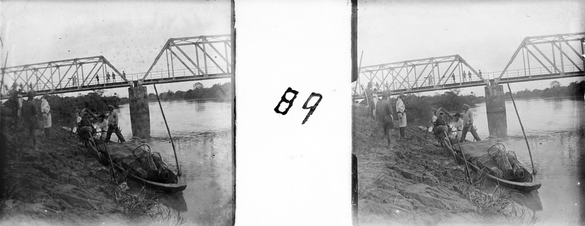 Mannen in gesprek bij een ijzeren brug over de rivie...