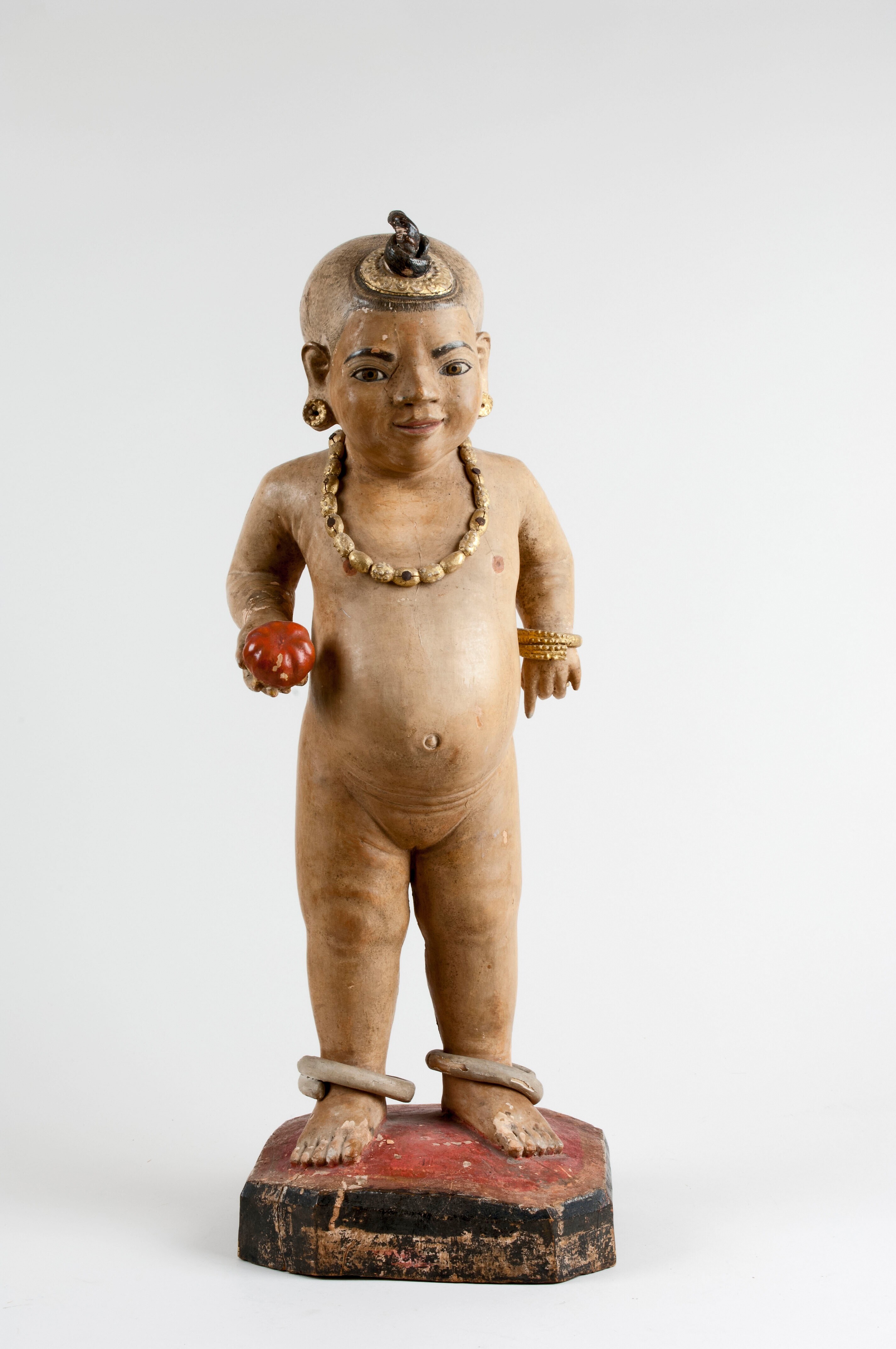 Wooden figure of a female child with fruit