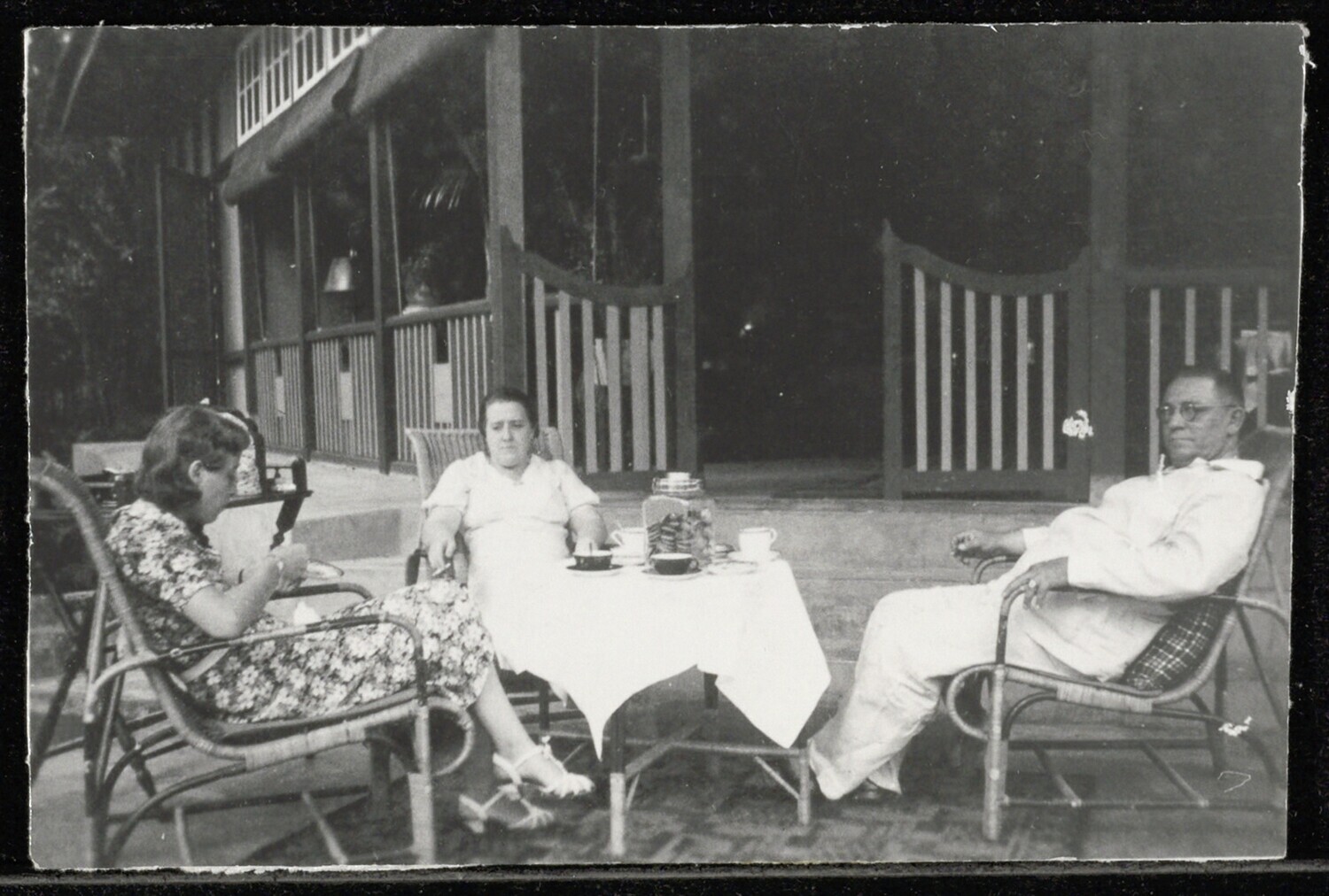 Man, twee vrouwen en een kind op de trap voor een huis