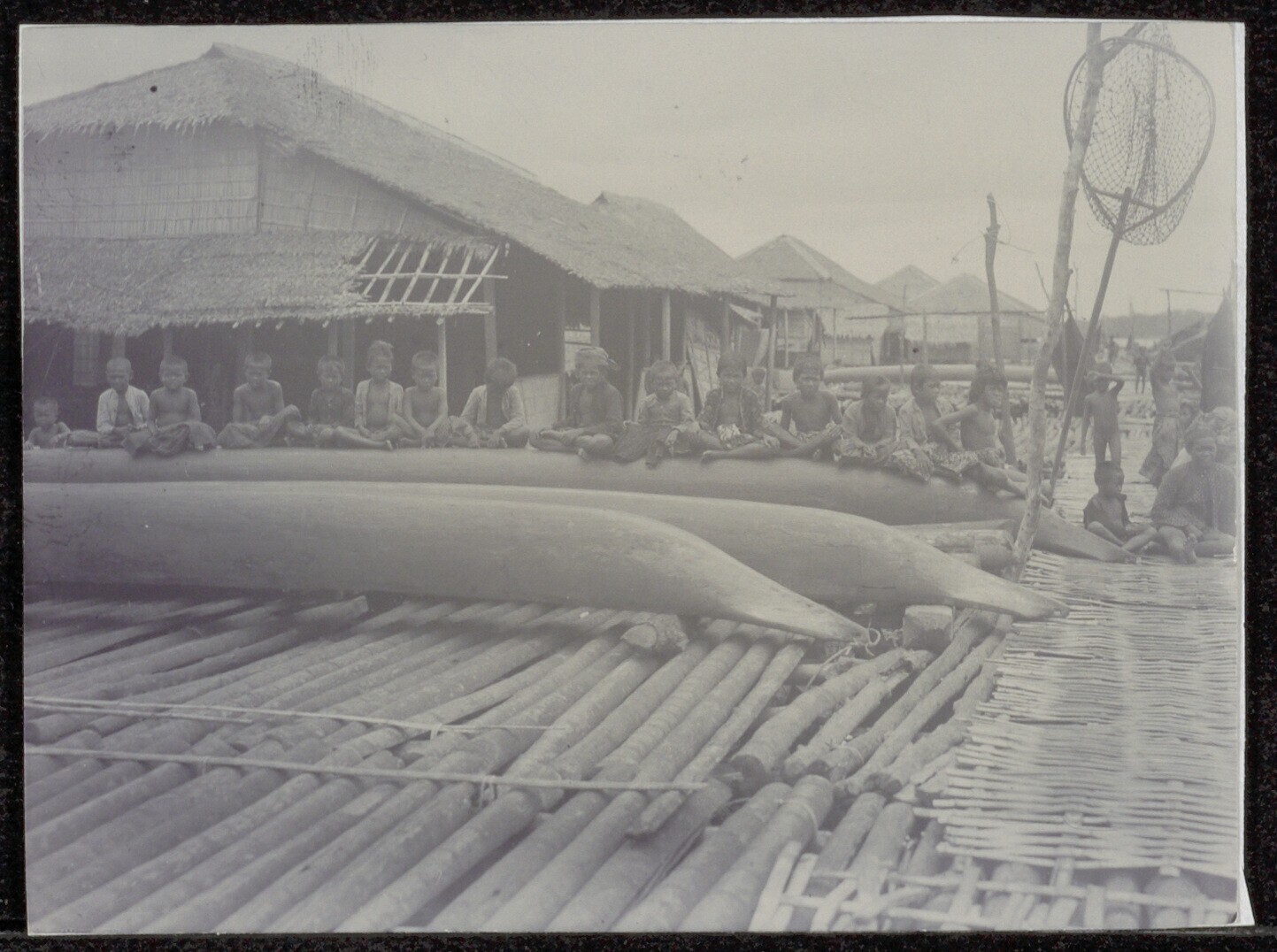 Een rij kinderen op de rug van een prauw in een paal...