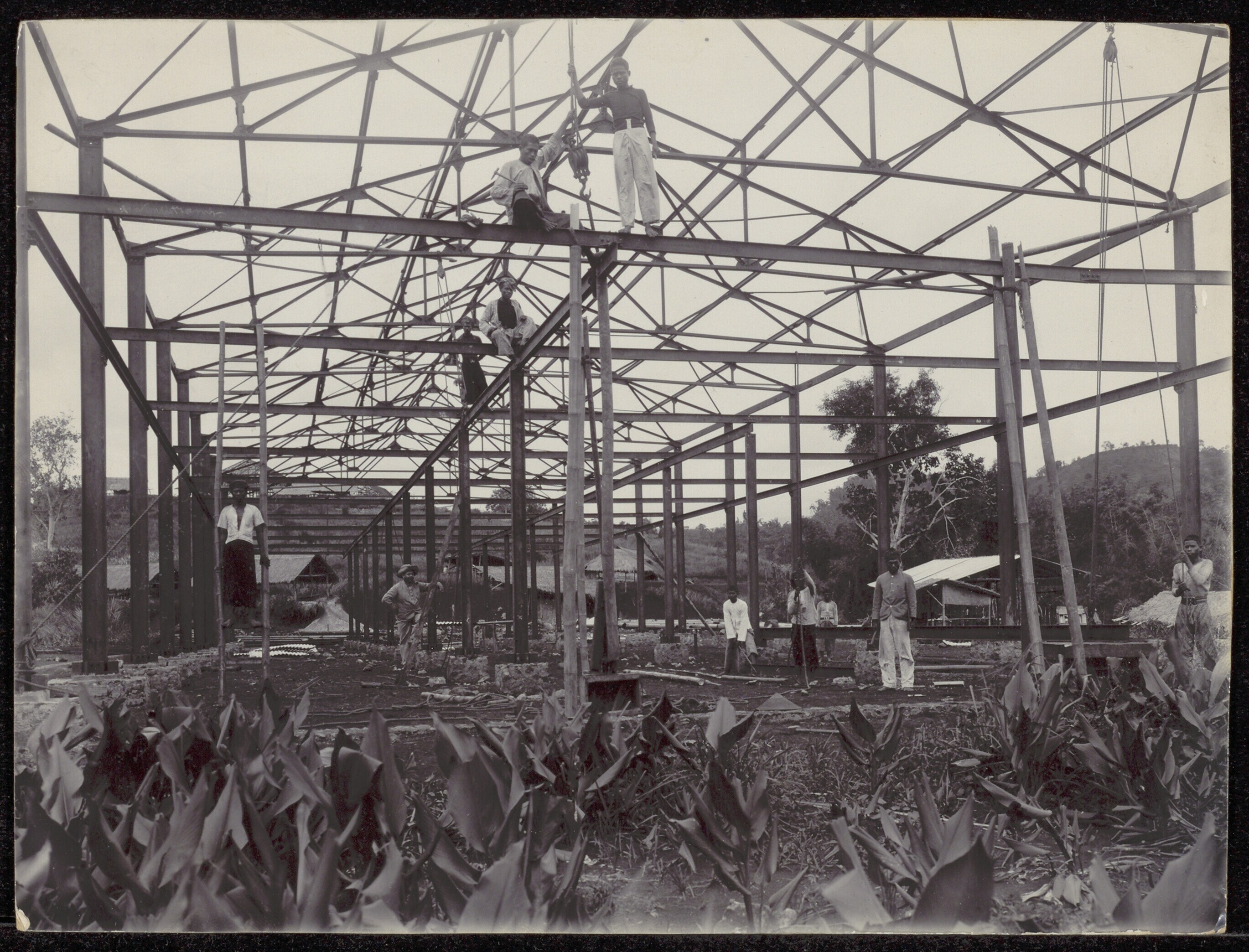 Javaanse bouwvakkers bij het ijzeren skelet van een ...
