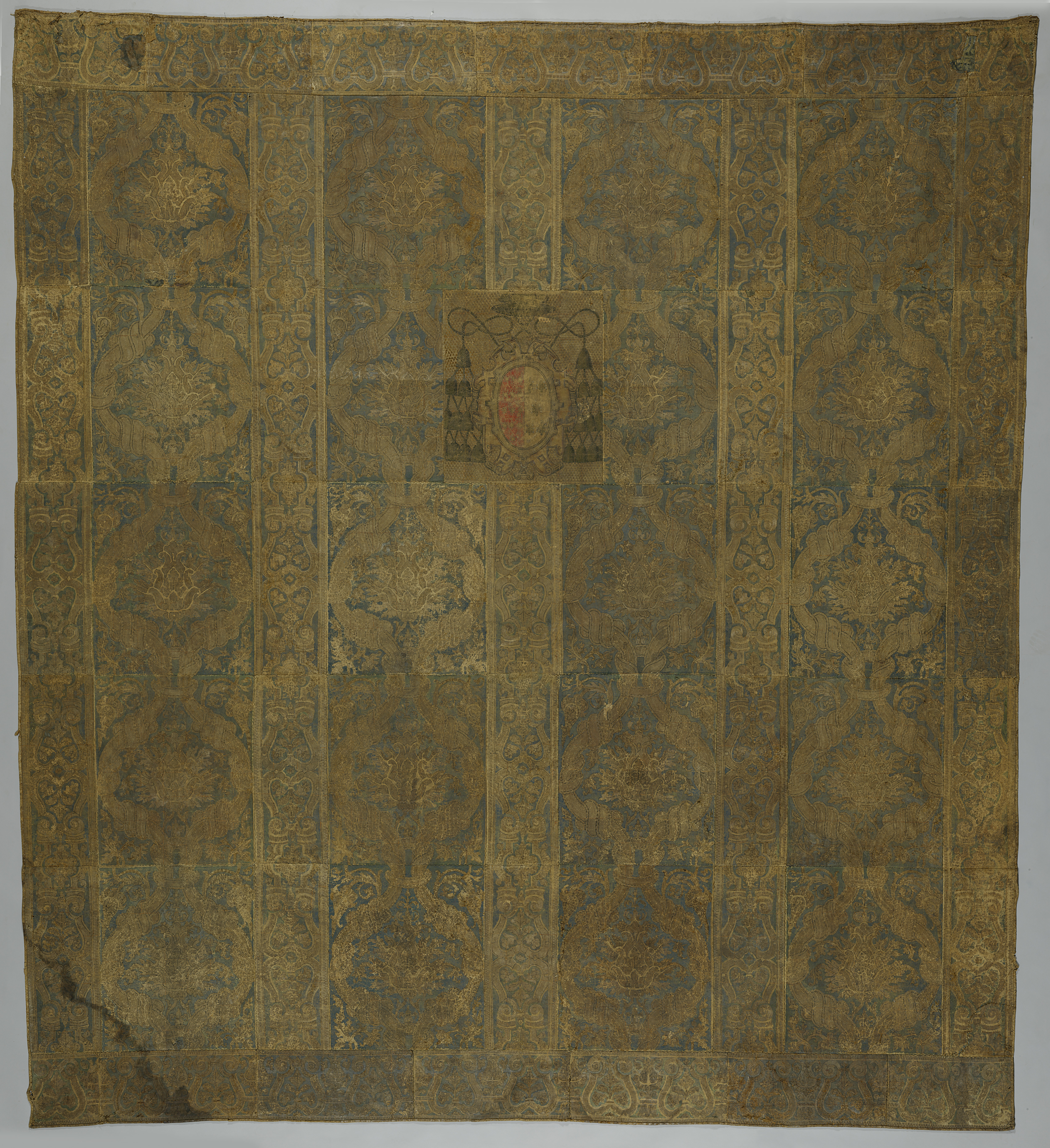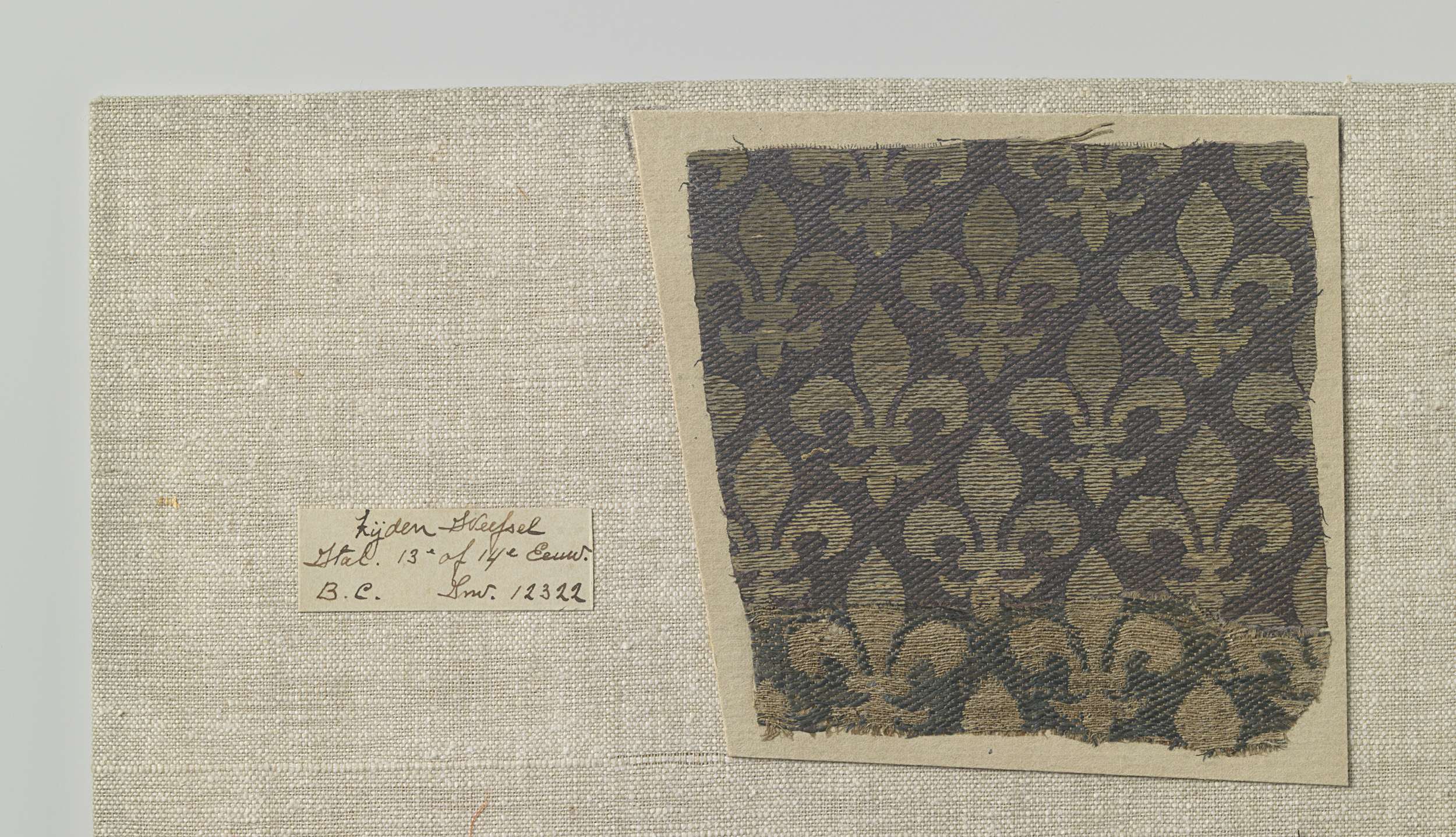 Fragment blauw samiet met patroon van fleurs-de-lis ...